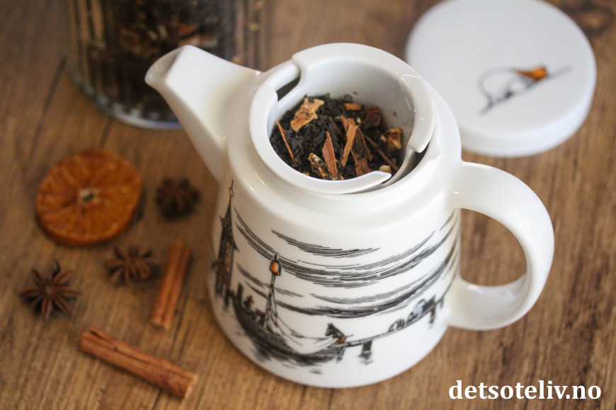 For en tekanne bruker jeg 3 spiseskjeer av teblandingen. I den nydelige Mummi-tekannen er det en innebygd tesil som følger med.