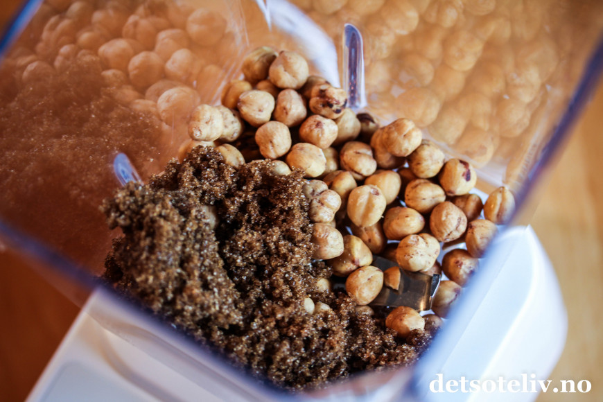 Ha hasselnøttene i en kraftig blender. Tilsett også brunt farinsukker.