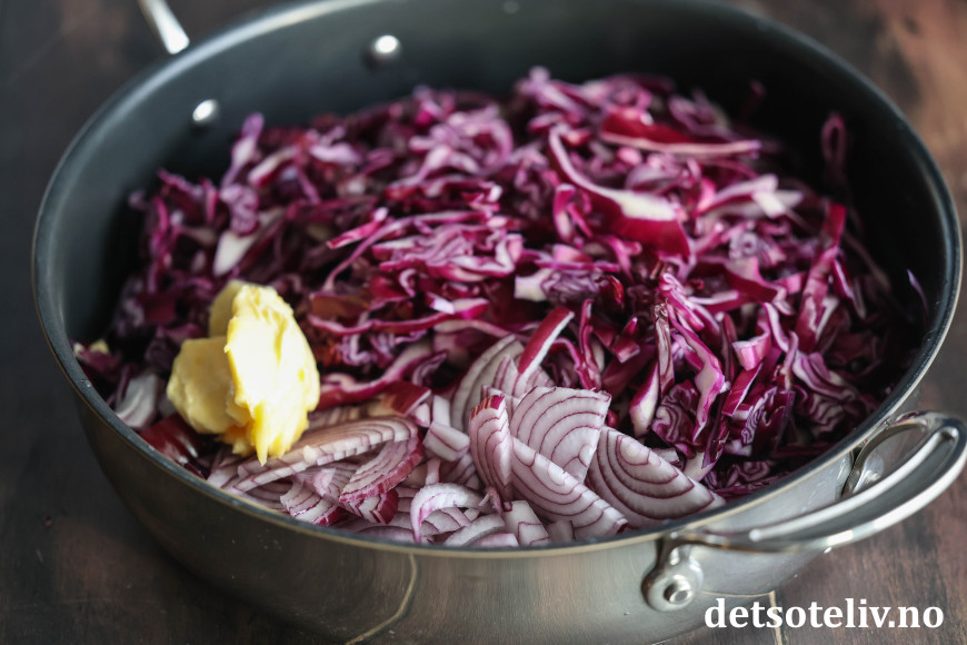 Ha rødkål og rødløk i en stor kjele, eller bruke en panne med høye kanter som jeg har brukt her.