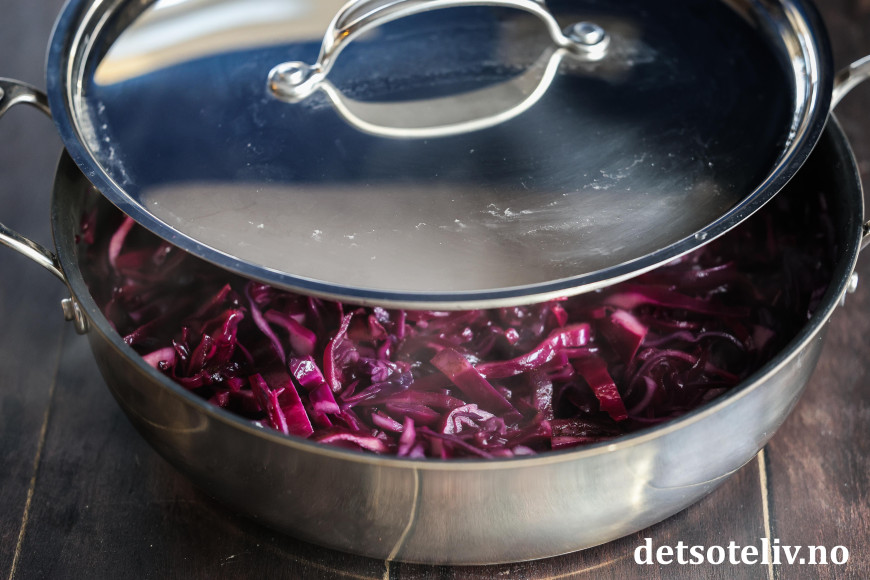 ♥ Følg med underveis i kokingen om det er nok væske i rødkålen, for det er viktig at den ikke svir seg i bunnen av kjelen. Du kan eventuelt spe på med mer væske, som kan være mer appelsinjuice, solbærsirup eller bare vann. Dersom du synes det er for mye væske i rødkålen, er det bare å ta av lokket på slutten av koketiden slik at noe av væsken fordamper.