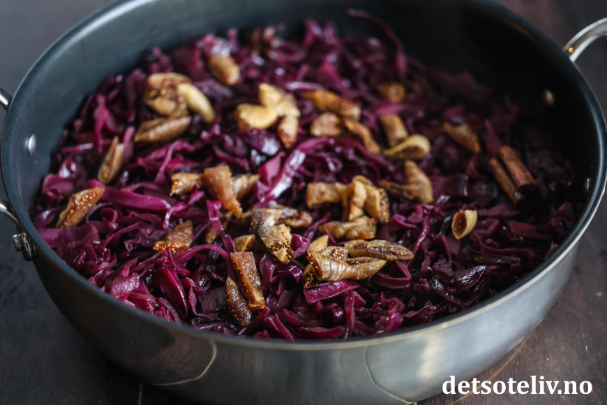 Klipp tørkede fiken opp i mindre biter og tilsett. Småkok rødkålen videre i ca. 20 minutter til.