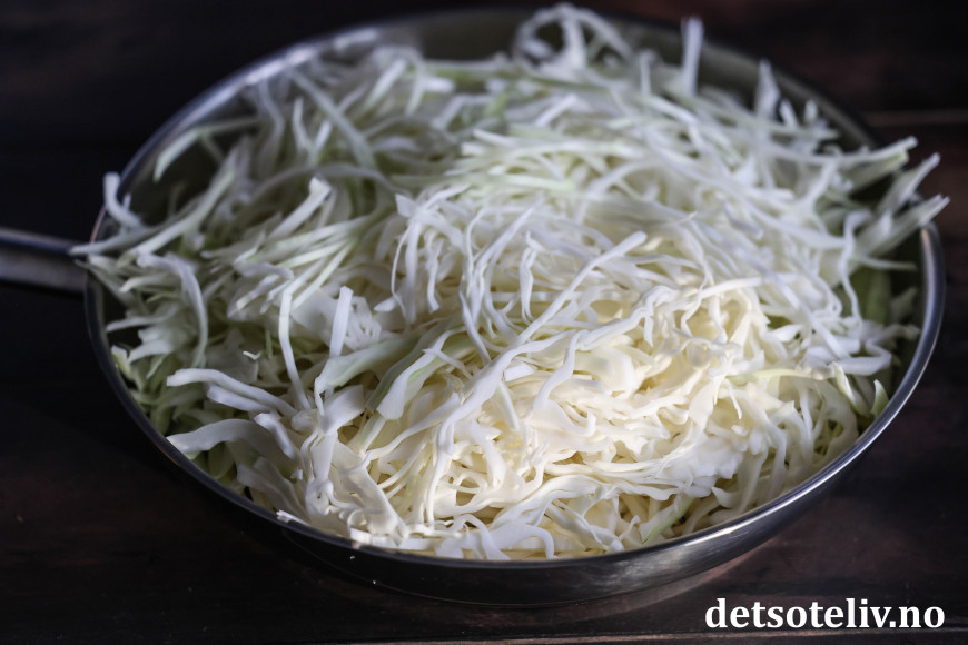 Snitt opp kålstykkene i fine strimler. Du kan bruke en god kniv til dette, men enda lettere er det å bruke en mandolin (pass på så du ikke skjærer deg).