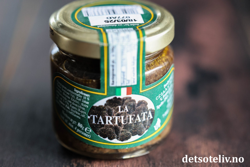 ♥ Trøffelmos på glass fås kjøpt i velassorterte matbutikker og delikatesseforretninger. Jeg har her brukt ferdigkjøpt, italiensk trøffelmos som heter "La Tartufata". Mosen inneholder finhakket sommertrøffel, men også mos av sjampinjong, sorte oliven, kapers og ansjos. Det går fint å bruke annen type trøffelmos, og det er flere varianter å få kjøpt. I stedet for trøffelmos, kan du bruke trøffelskiver som ligger i olivenolje (kjøpes også på små glass). Finhakk da selv noen av trøffelskivene med litt av oljen de ligger i, slik at de blir til en mos før du blander inn i majonesen. Tilpass mengden til hvor sterk smak det er på trøffelmosen og hva du liker.