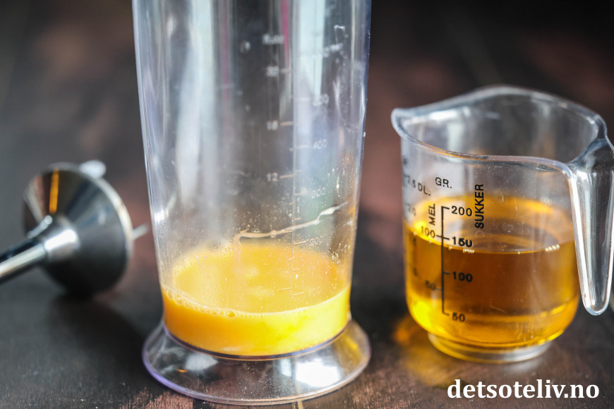 Hell så i litt og litt av oljen mens du kjører i vei med stavmikseren hele tiden. Ta noen pauser med oljen, og la stavmikseren kjøre litt ekstra mellom hver gang du heller i oljen. Det er viktig at oljen innarbeides gradvis inn på denne måten, ellers kan blandingen skille seg. Etter hvert vil du se at det danner seg en tykk, lysegul majones.