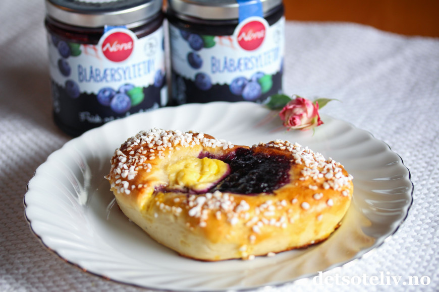 Enda nydeligere blir bollene av fyllet, som er en herlig kombinasjon av hjemmelaget vaniljekrem og syltetøy laget av deilige bær. Syltetøyet er ikke hjemmelaget, men det smaker akkurat som om det skulle vært det! Trikset er å bruke det nye syltetøyet til Nora, som har en helt unik smak fordi det inneholder 70% bær og er ekstra skånsomt varmebehandlet. Du finner syltetøyet i kjøledisken i butikkene. Nora Kjølt syltetøy 70% finnes i smakene jordbær, bringebær og blåbær, og jeg har brukt alle tre typene i disse skjønne hjertebollene.