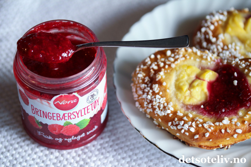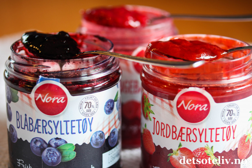 ♥ For god smak på bollene bør du bruke syltetøy av skikkelig god smak av bær. Jeg kan anbefale det nye syltetøyet Nora Kjølt med 70 % bær, som er det beste kjøpte syltetøyet jeg noen gang har smakt! Nora Kjølt syltetøy 70% kommer i smakene jordbær, bringebær og står i kjøledisken i butikkene, blant annet hos Coop Mega, Rema, Mega, Bunnpris og OBS.