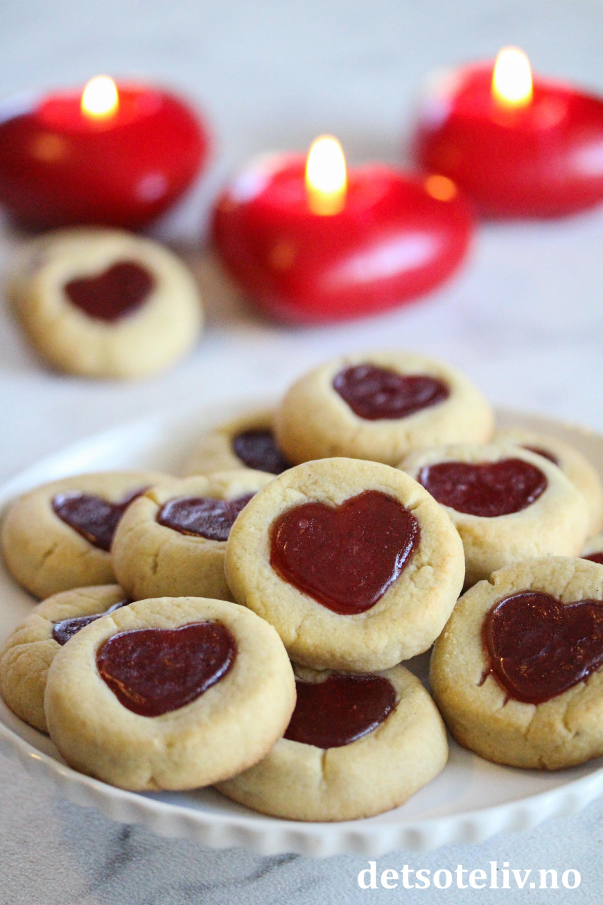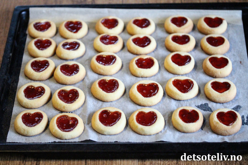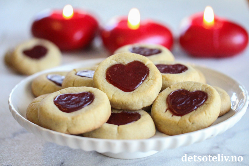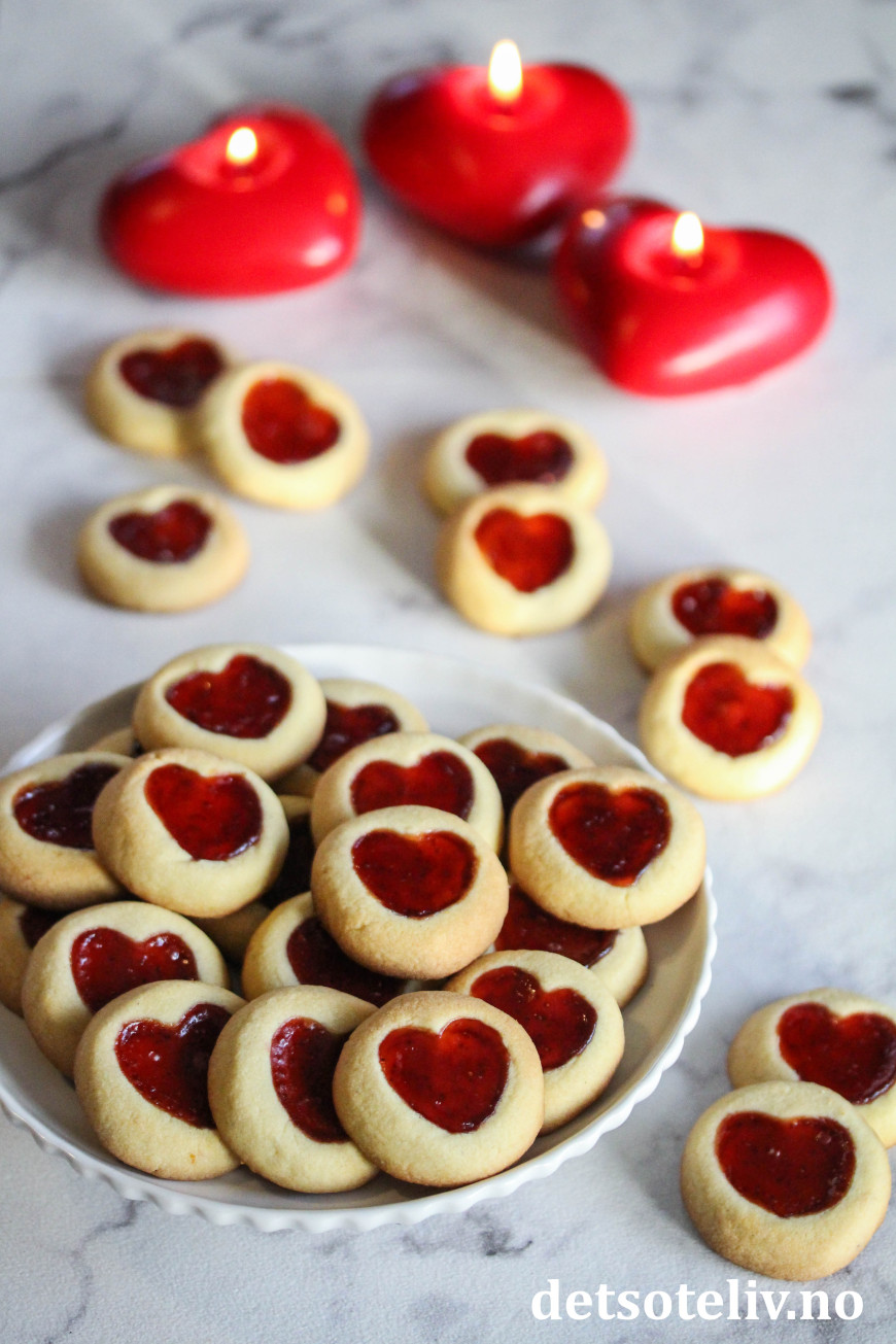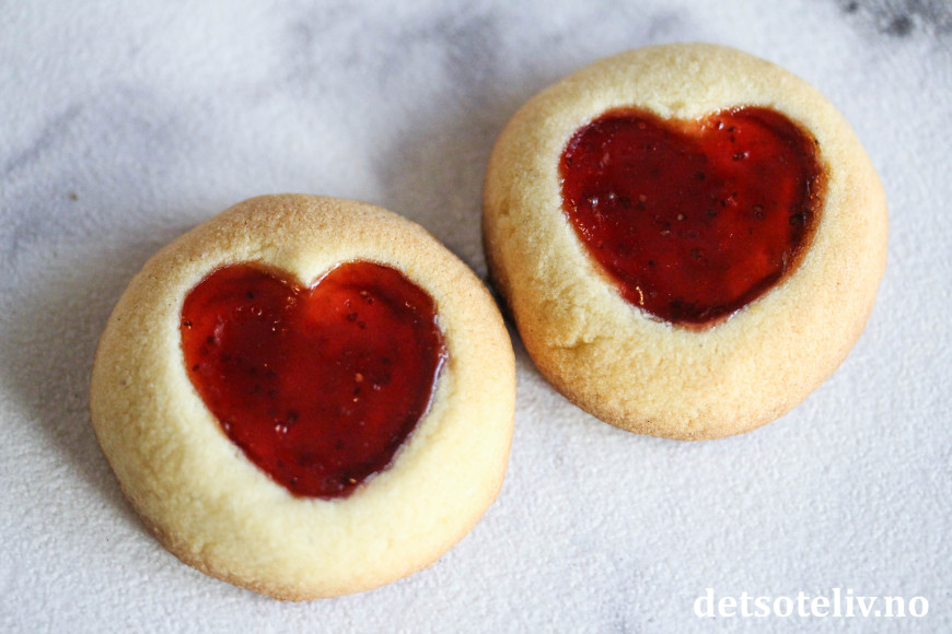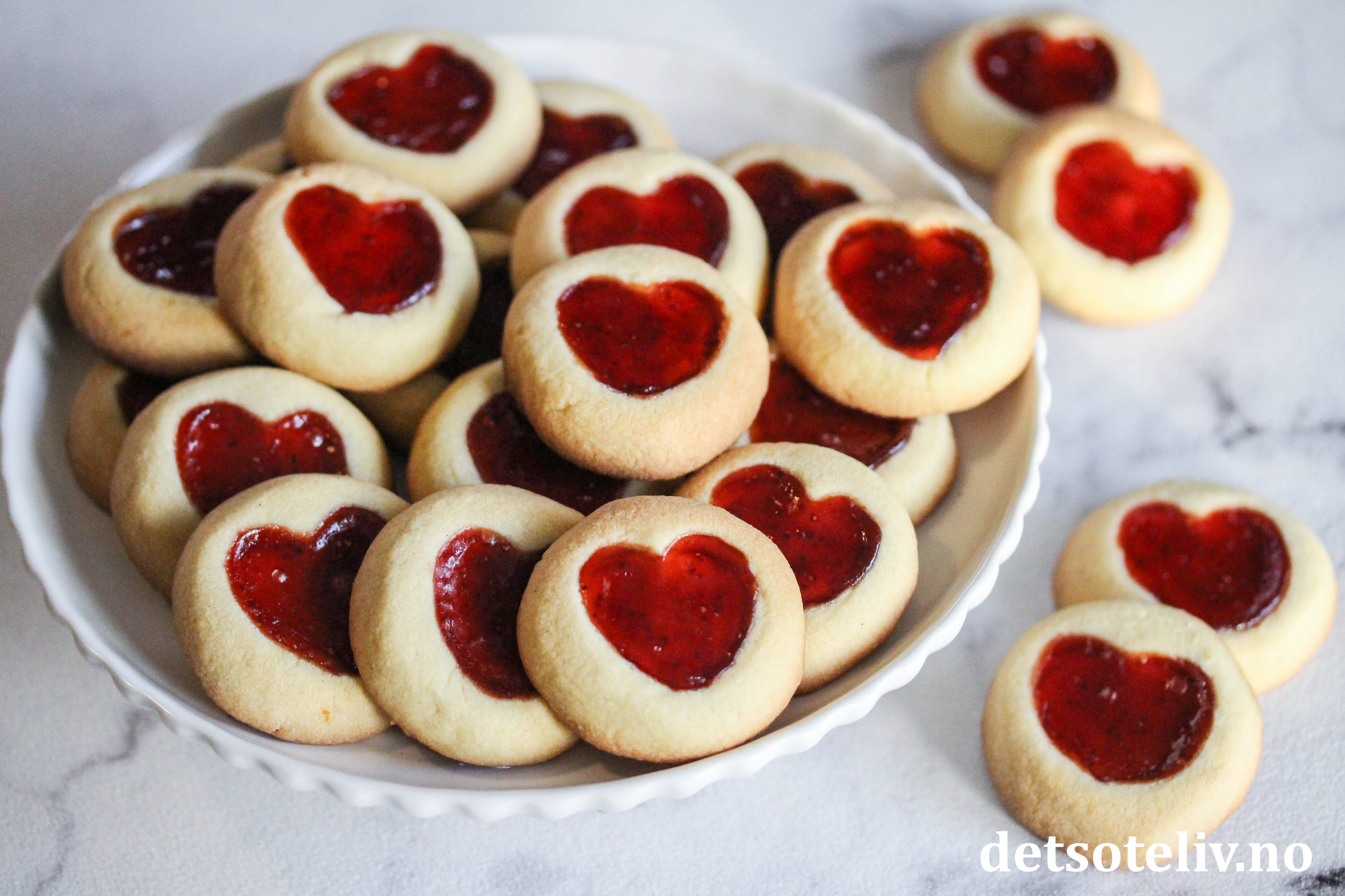 Her er et tips om hvordan du enkelt lager søte småkaker med koselig hjertemotiv. Småkakene består av mørdeig med vaniljesmak og jordbærsyltetøy i fyllet.