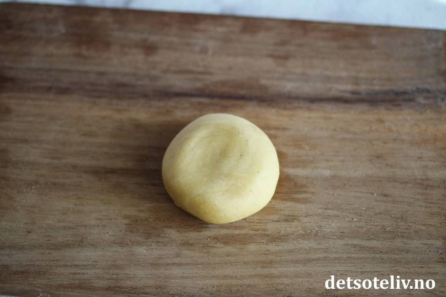 Klem deigen sammen. Hvis deigen kjennes klissete, pakker du den inn i plastfolie og lar den stå i kjøleskapet en stund, til deigen ikke er klissete lenger, men fortsatt myk.