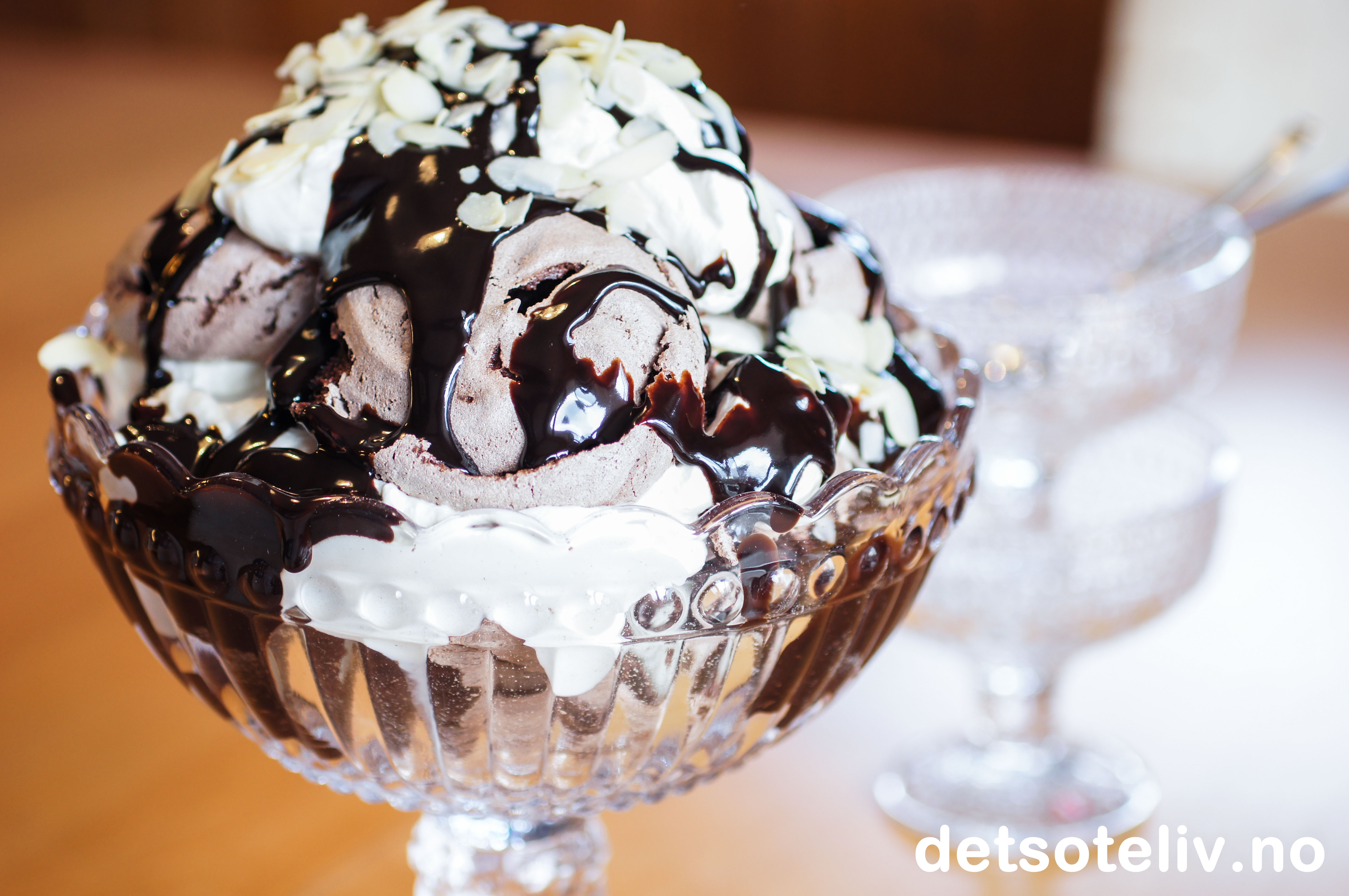 Legg marengs, iskrem og pisket krem lagvis i en serveringsskål. Dryss over mandelflak og hell over rikelig med sjokoladesaus.