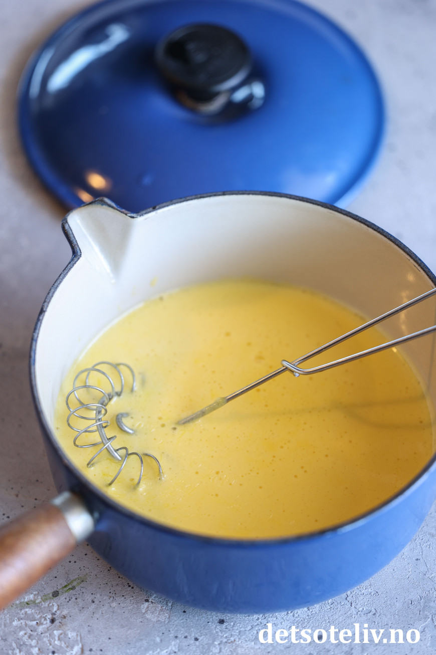 ♥ Merk at det smeltede, klarnede smøret skal piskes gradvis inn i eggemassen. Tilsett litt og pisk kraftig, og se at smøret har blitt godt inkorporert i sausen før du sper med litt mer.