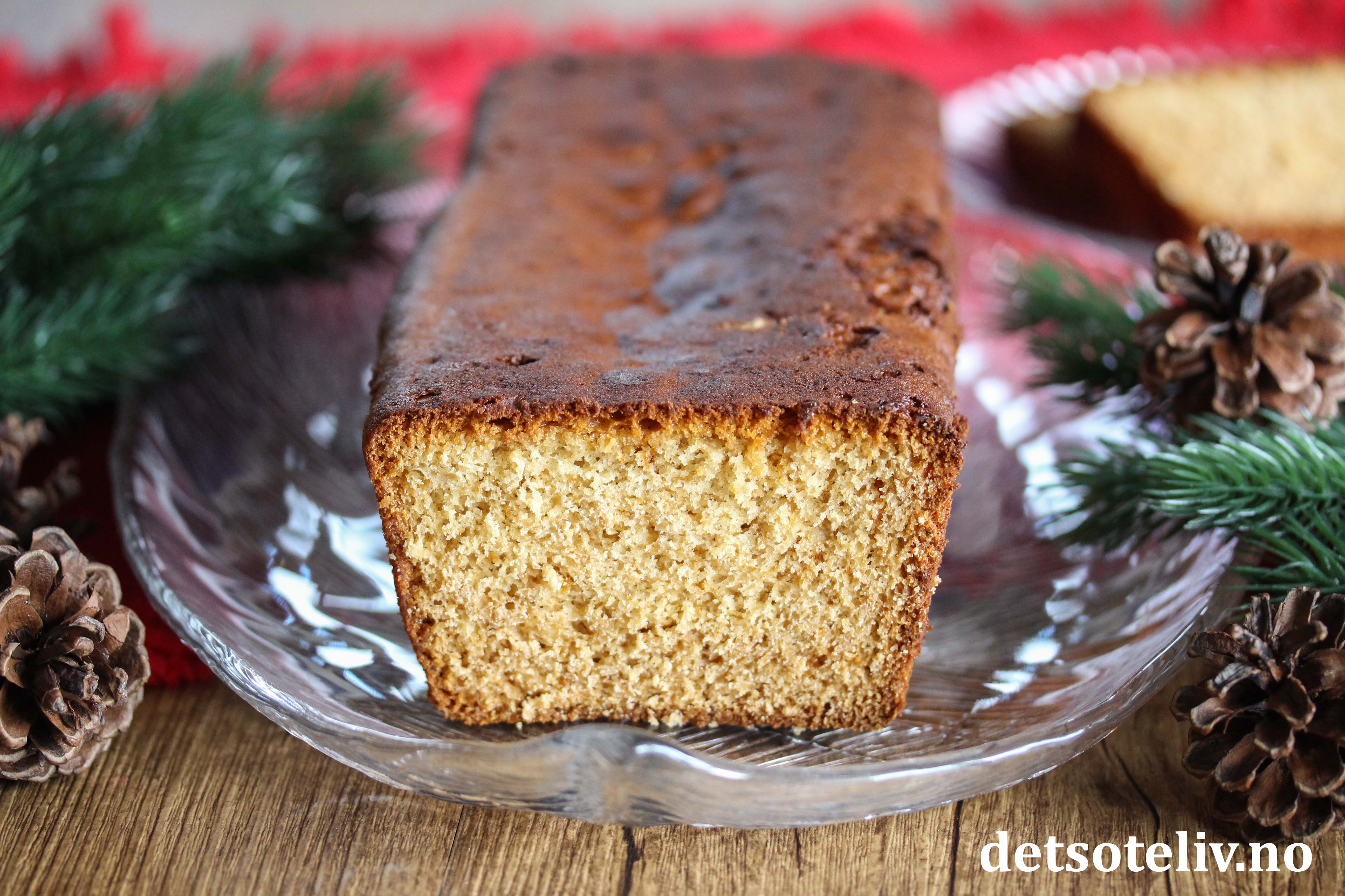 Ha deigen i en smurt, avlang form (1,5 liter) med bakepapir i bunnen. Stek kaken på nederste rille i ovnen ved 180°C i ca. 45-50 minutter. Dekk til kaken med et stykke matpapir etter 40 minutter steketid for å unngå at kaken blir altfor mørk på toppen.