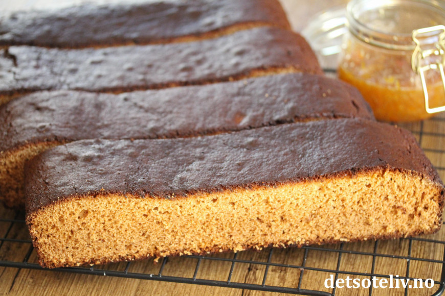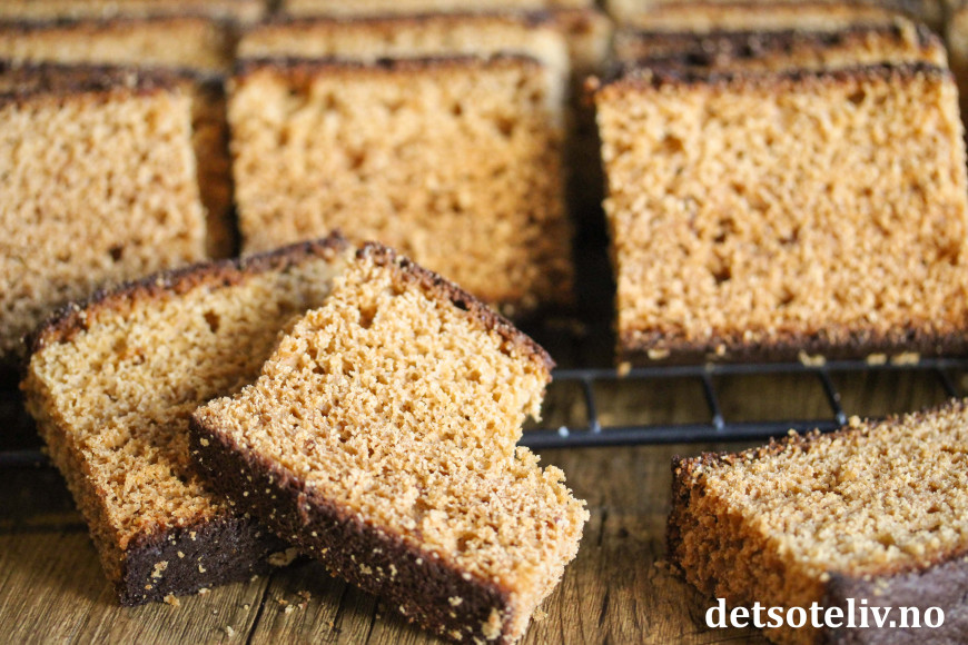Ha deigen i en stor, bakepapirkledd langpanne (ca 30 x 40 cm). Stek kaken nederst i ovnen ved 180°C i 45–55 minutter (sjekk med kakenål når kaken er gjennomstekt).