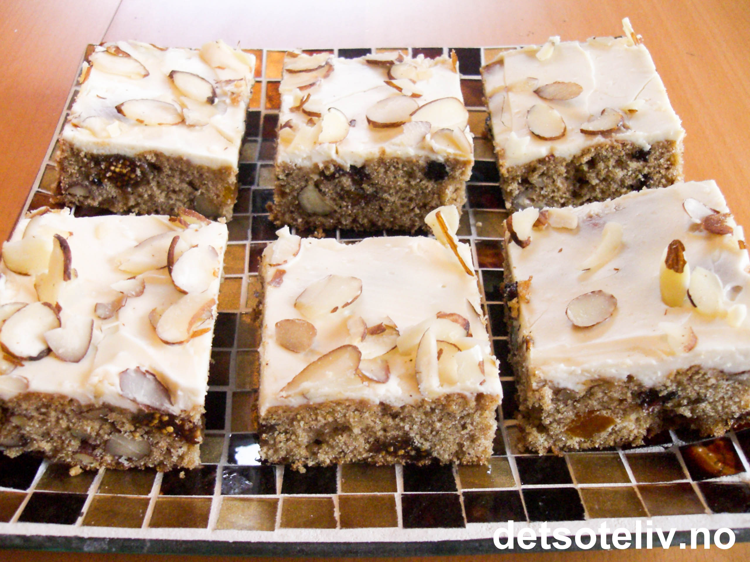Bland alle ingrediensene til glasuren og pisk den luftig. Bre ostekremen jevnt over kaken og pynt med mandelflarn. Skjær kaken opp i firkantede serveringsstykker.