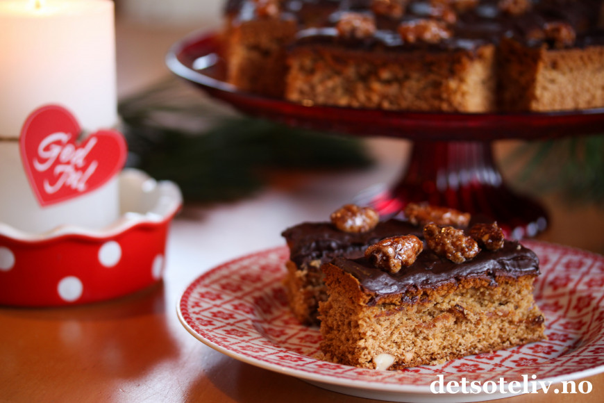 Dette er en kjempegod, krydret honningkake som bare blir bedre og bedre ved lagring. Kaken er god som den er, men litt smeltet sjokolade og noen karamelliserte mandler på toppen gir det lille ekstra.