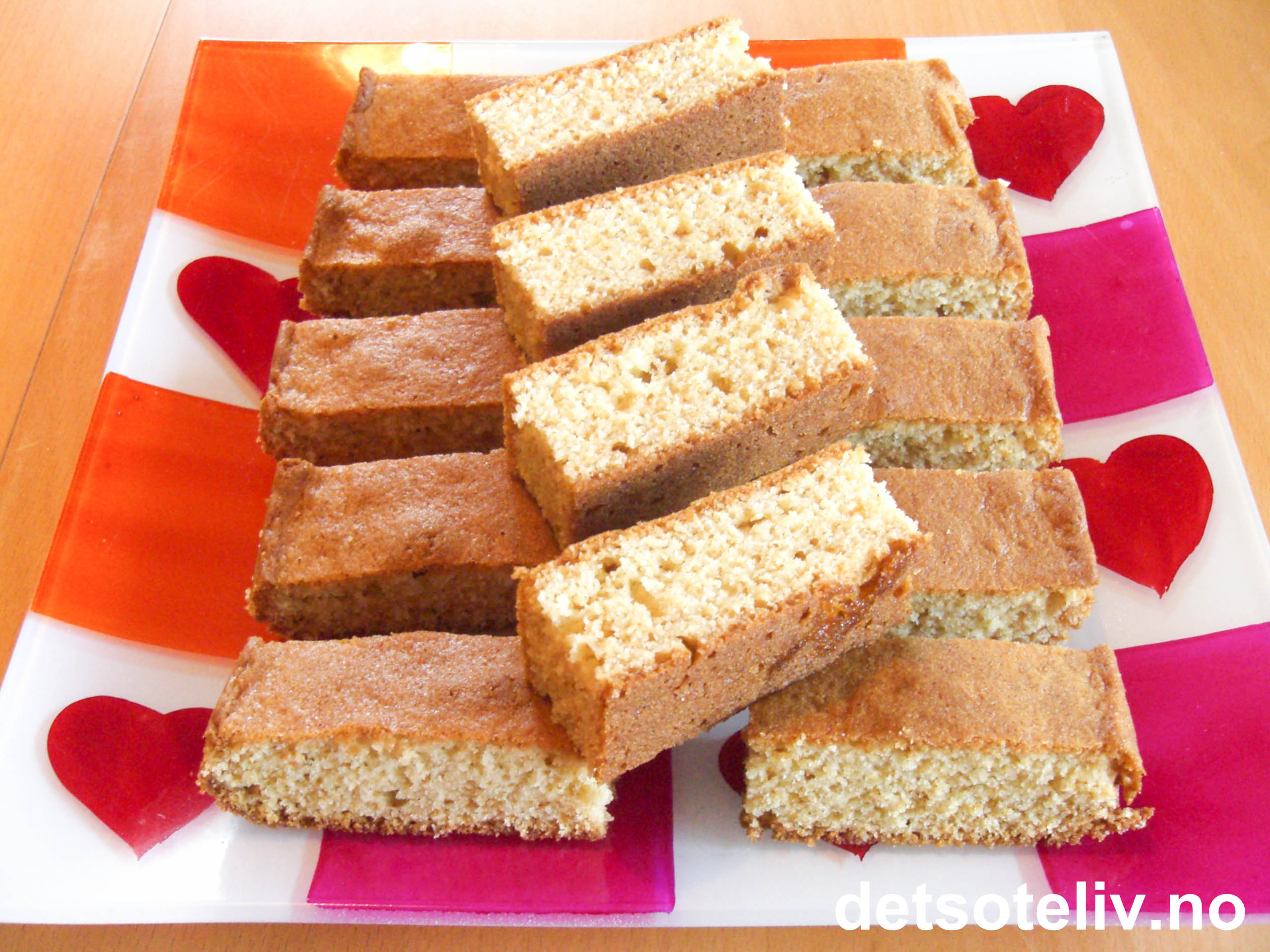 Avkjøl kaken i formen. Hvelv den så ut av formen og fjern bakepapiret. Del kaken i 3 deler på langs. Skjær hver del i passe tykke skiver.