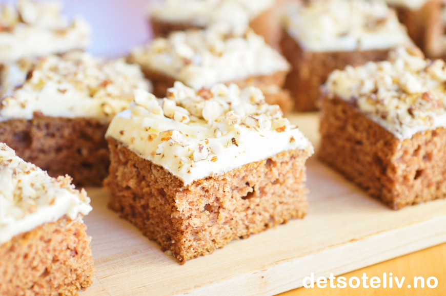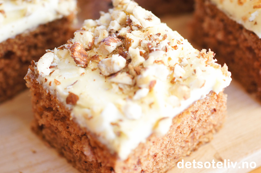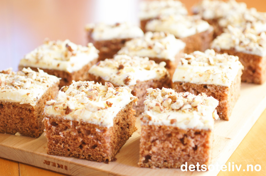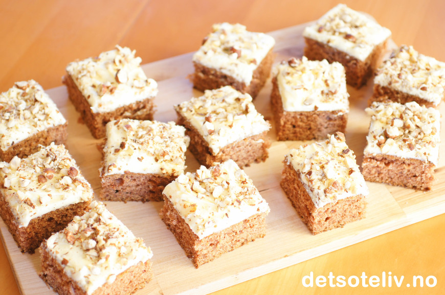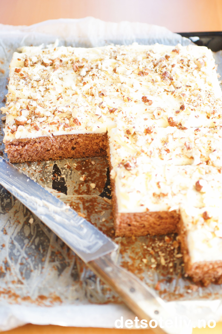 ♥ Se også oppskrift på Krydderkake med ostekrem, som er samme kake, men uten nøtter.