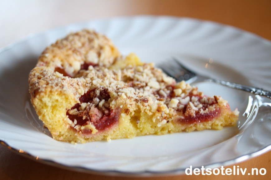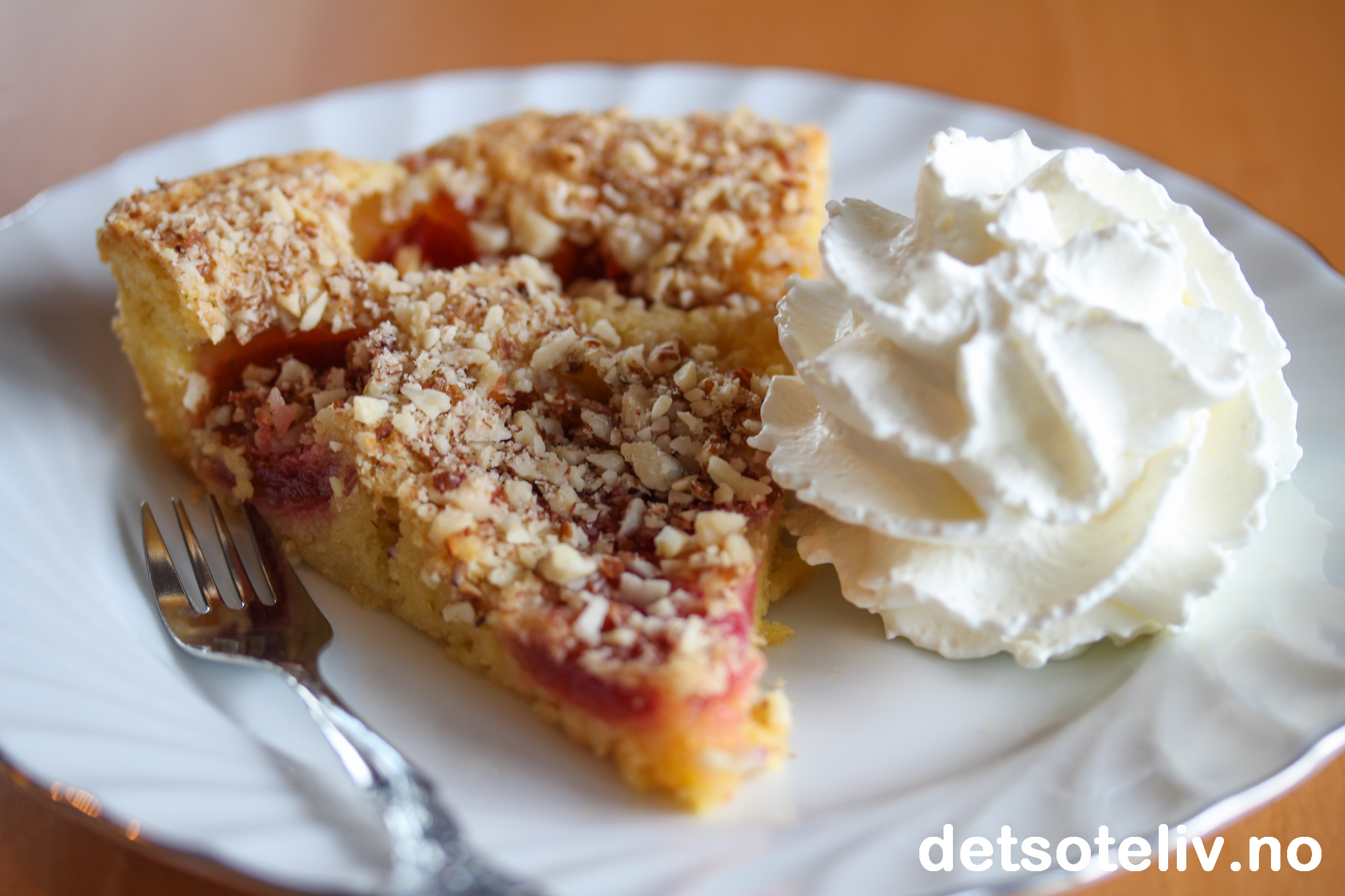 Du bare rører deigen raskt sammen og heller i formen. På toppen legger du plommebiter som er blandet med sukker og kanel, og til slutt drysser du på perlesukker og fint hakkede mandler.