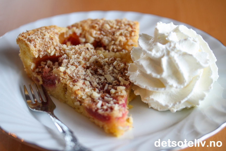 Etter en snau halvtime i ovnen har du en veldig deilig plommekake.