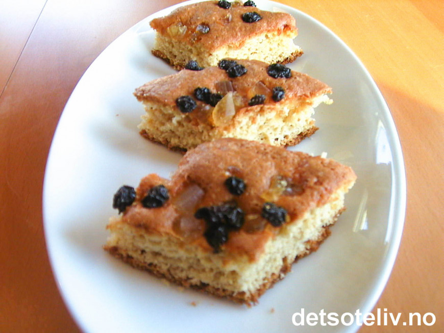 Hell deigen i en liten, bakepapirkledd langpanne (ca 20x30 cm). Strø over korinter og sukater.