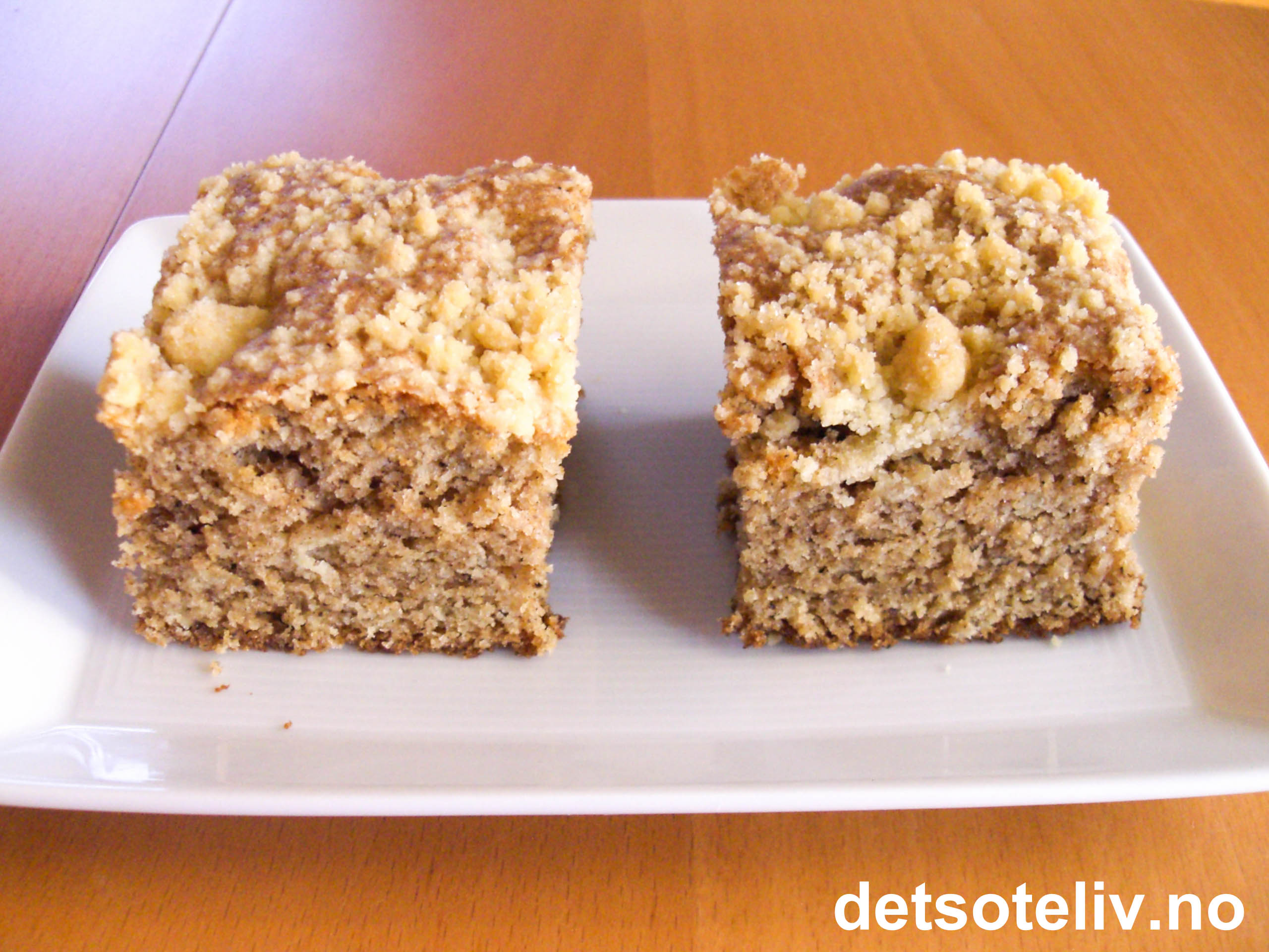 Ikke hvelv den ferdigstekte kaken ut av langpannen, for da kan strøsselet på toppen falle av. Det er bedre å løfte kakestykkene ut med en stekespade.