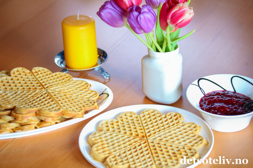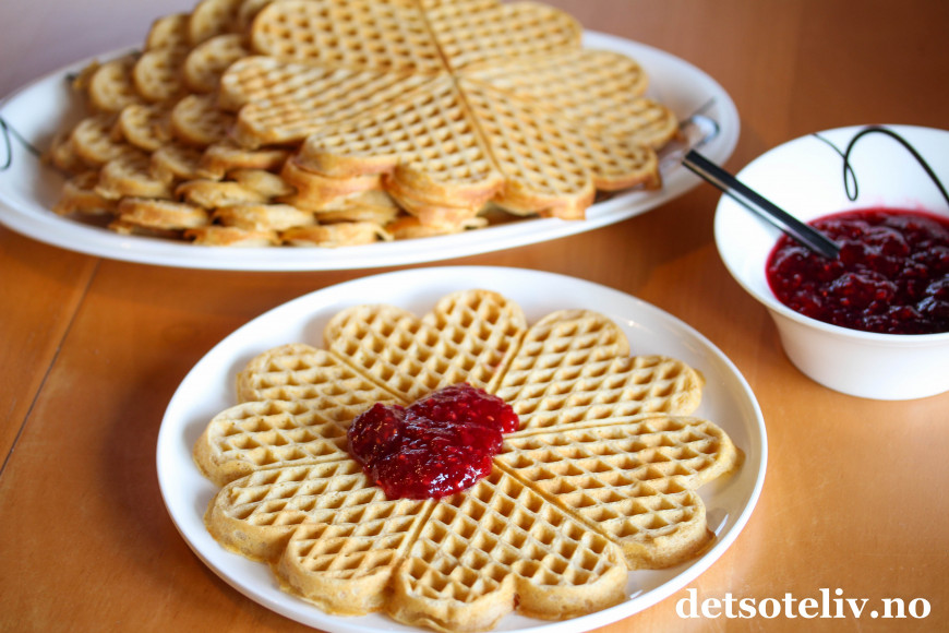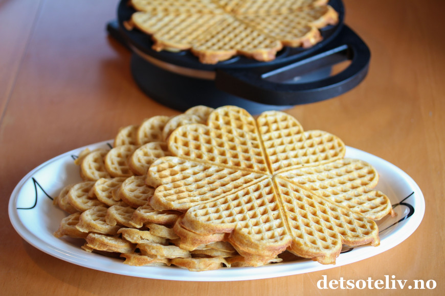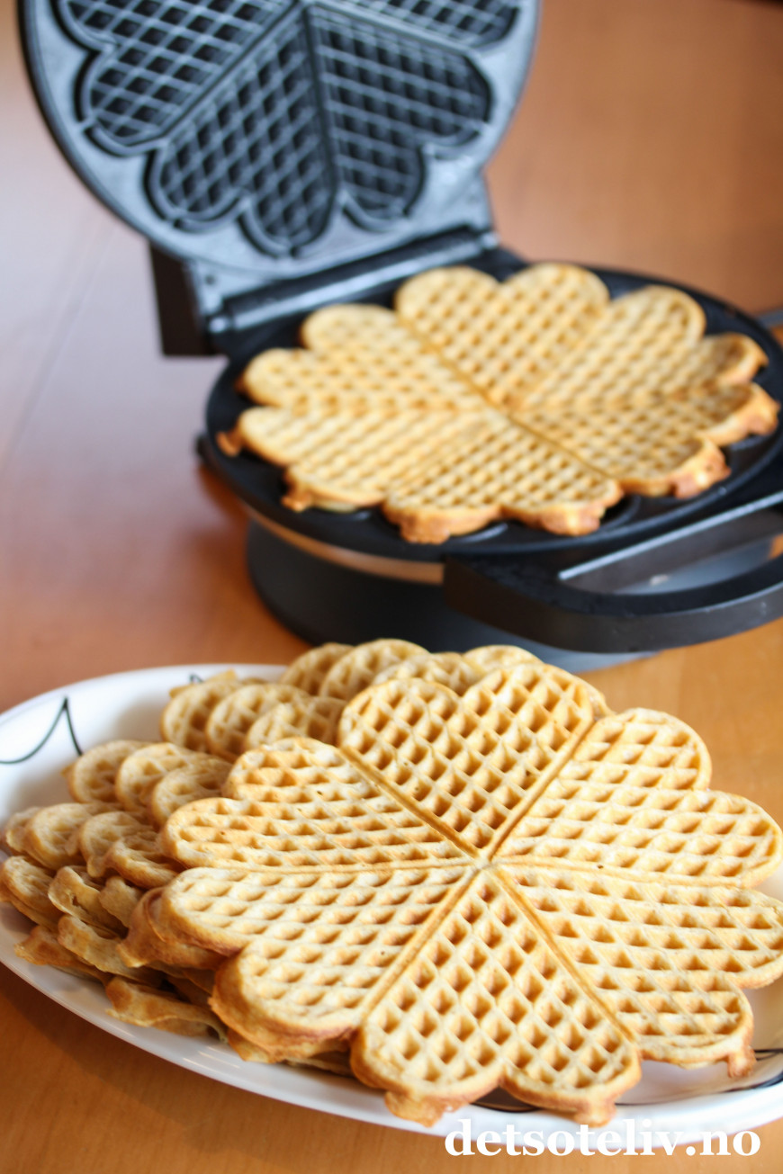 Vaflene er stekt i vaffeljernet "Hjerte Stor Piip", som er sponset av Wilfa.