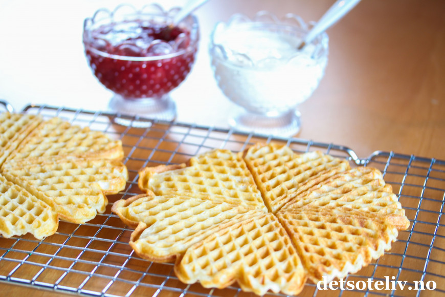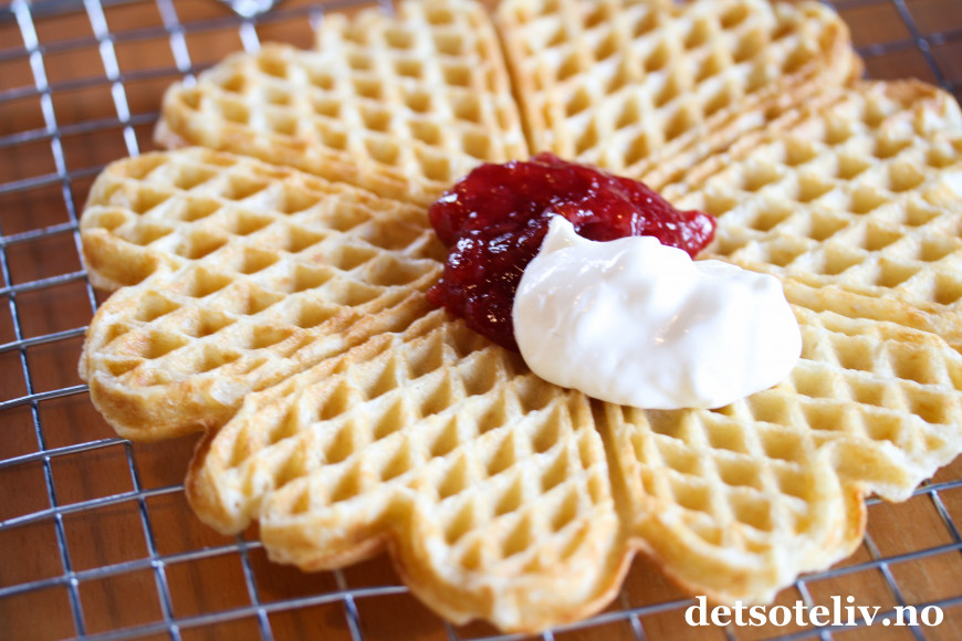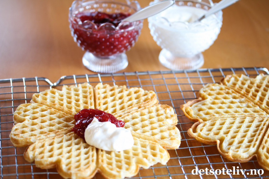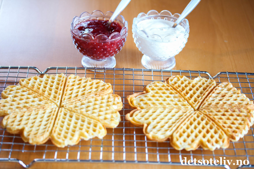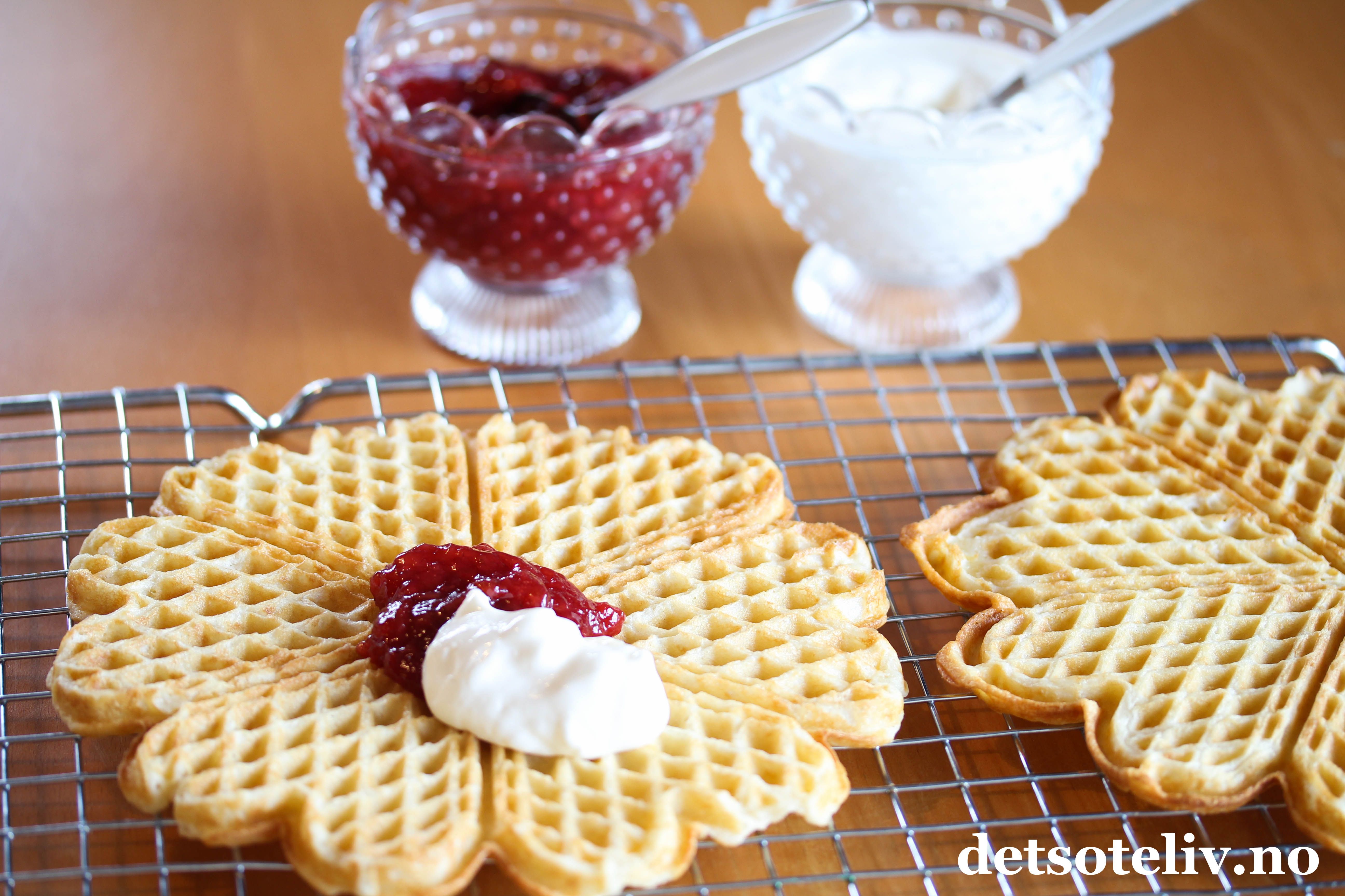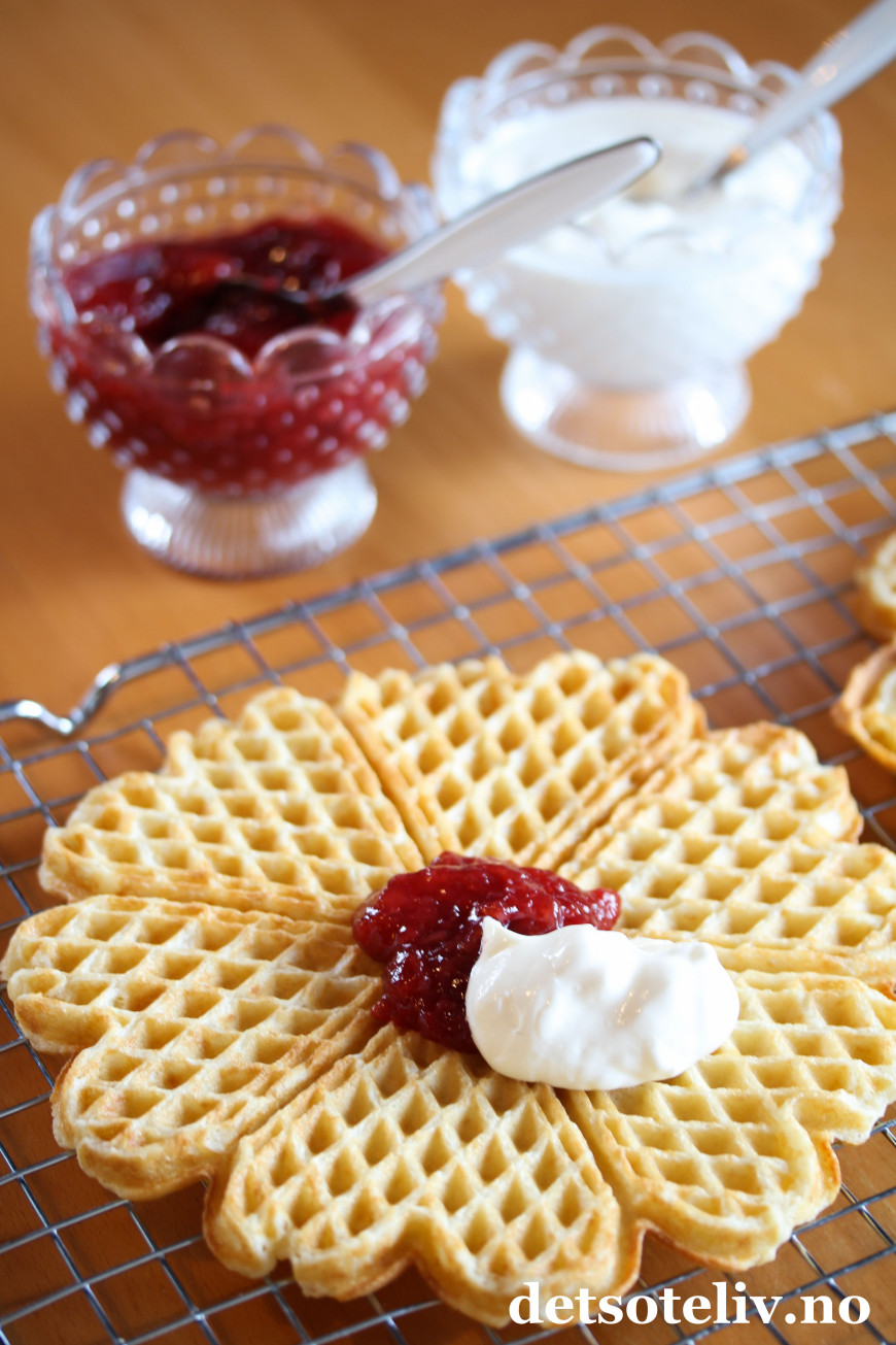 Server vaflene med brunost, syltetøy, rømme - eller det du liker best!