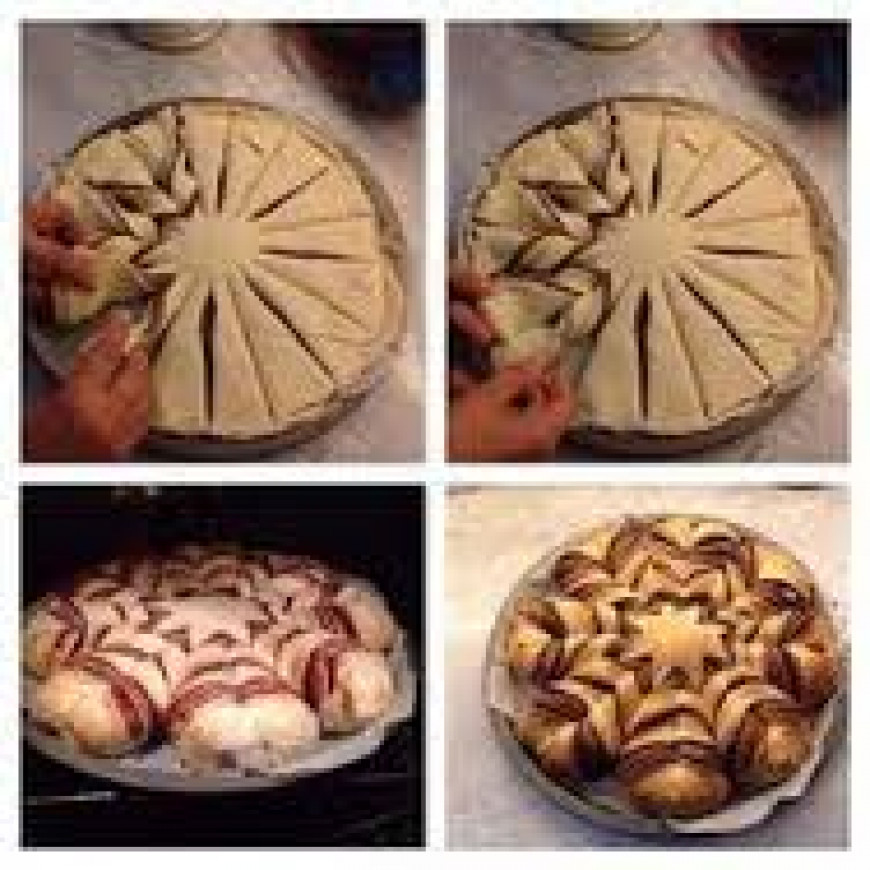Du har nå en fin, rund "kake" med fylt deig i fire lag på stekeplaten. Marker en sirkel på midten av kaken ved å presse lett ned med glass eller lignende. Ta så en skarp kniv og skjær fra ytterkanten av sirkelmerket på midten av kaken og ut til kanten, så du får remser som går ut fra sirkelen. Start med å dele kaken i 4. Del så hver av disse 4 delene i 3 eller 4 deler. Du får da 12 eller 16 remser (jeg valgte å dele min opp i 12 deler).