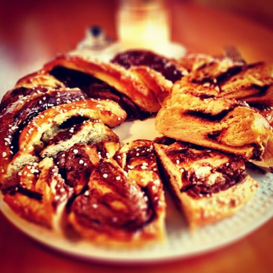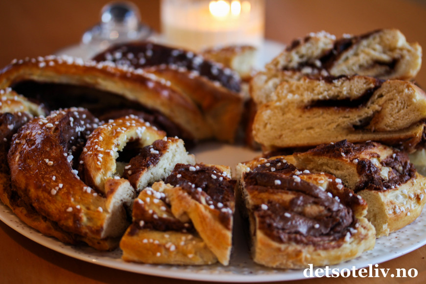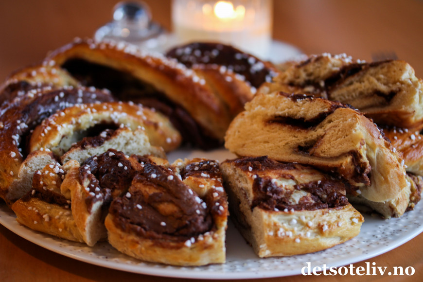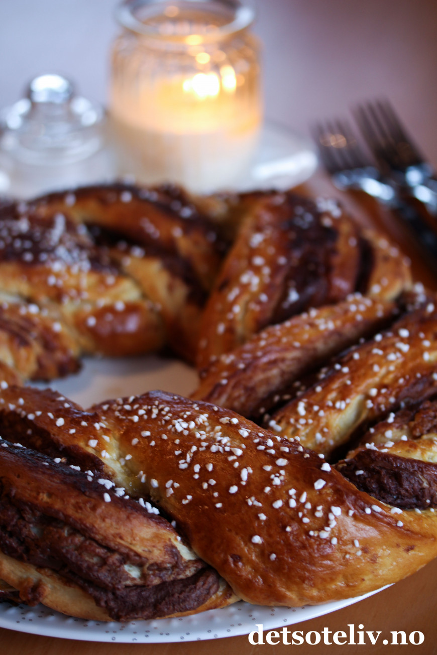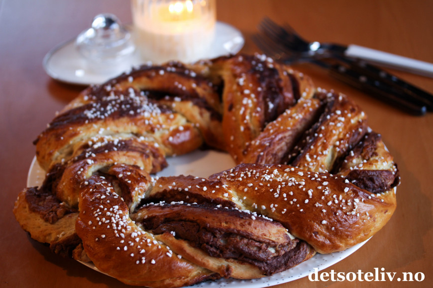 Kna deigen sammen med resten av hvetemelet. Trill ut deigen til en pølse som er omtrent 40 cm og kjevle den flat så den er ca 20 cm bred. Bred sjokoladepålegget over leiven og rull den så sammen fra langsiden så du får en tykk pølse. Bruken en skarp kniv og del pølsen på midten (dermed kommer sjokoladefyllet godt til synet). Legg hver del forsiktig og lett overlappende på en bakepapirdekket stekeplate og tvinn lendene sammen et par ganger og form en krans på bakeplaten. Klyp skjøtene godt sammen slik at kransen ikke åpner seg når den hever under stekingen.