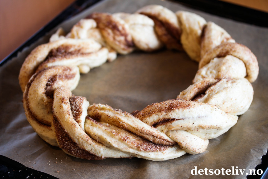 Bred mykt smør over leiven og dryss over rikelig med sukker og kanel. Rull leiven sammen fra langsiden så du får en tykk pølse. Bruken en skarp kniv og del pølsen på midten (dermed kommer kanelfyllet godt til synet). Legg hver del forsiktig og lett overlappende på en bakepapirdekket stekeplate og tvinn lendene sammen ganger og form en krans på bakeplaten. Klyp skjøtene godt sammen slik at kransen ikke åpner seg når den hever under stekingen.