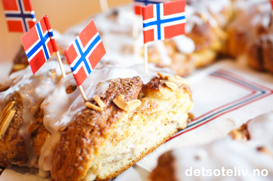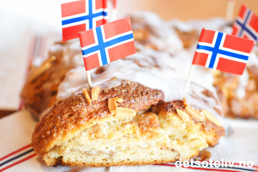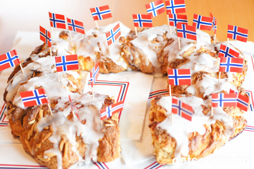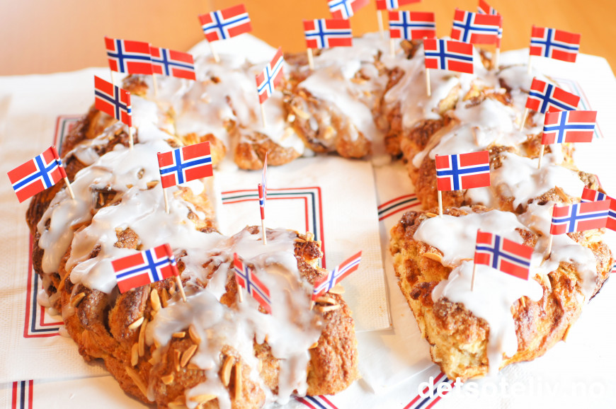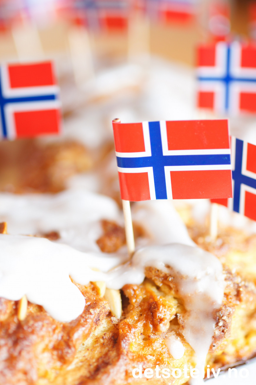 Lag melisglasur av melis og vann og fordel glasuren over hvetekransen. Pynt med norske flagg.
