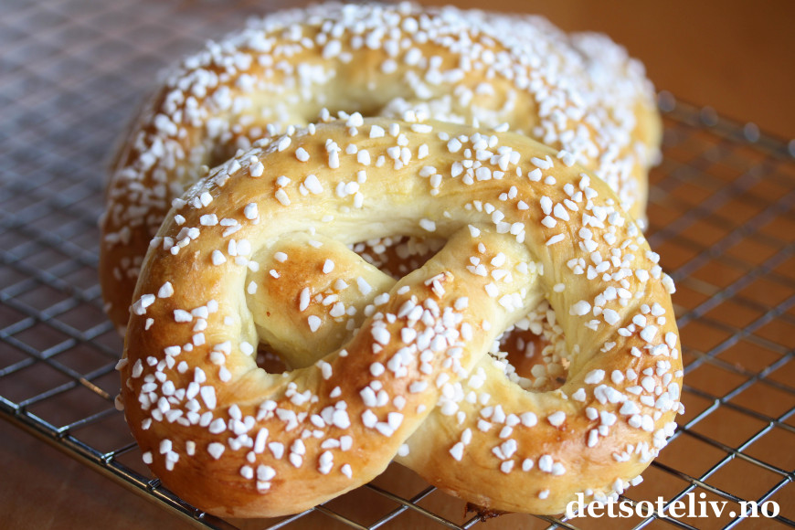Jeg har drysset kringlene med grovt perlesukker som beholder hvitfargen under stekingen (kjøpt i Sverige), men selv om dette hvite perlesukkeret selvfølgelig ser lekkert ut, går det for smakens skyld like godt å bruke vanlig, norsk perlesukker.