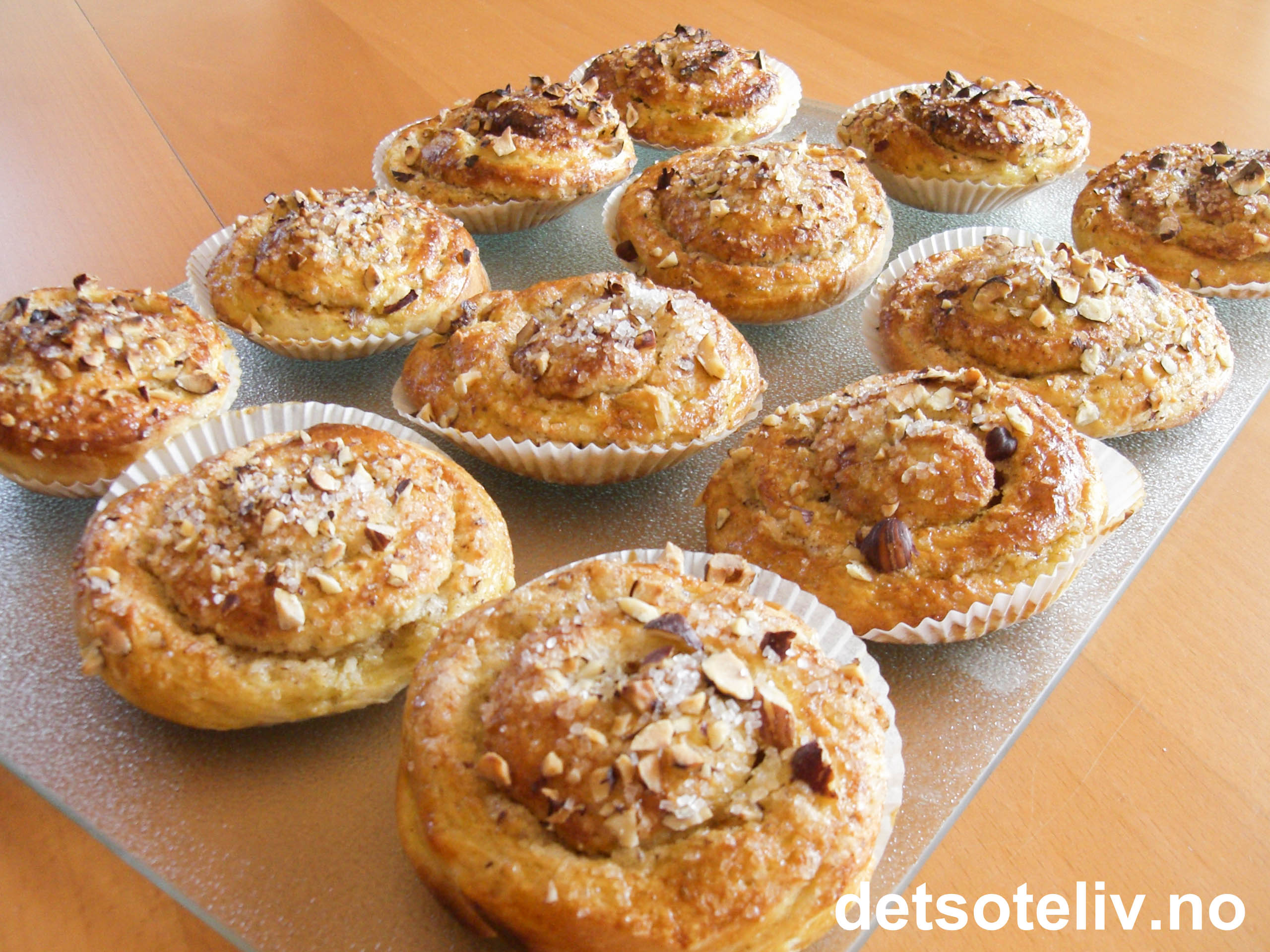 Kna den ferdighevede deigen med resten av hvetemelet. Del deigen i to. Kjevle ut hver del til rektangler. Smør fyllet på leivene i et tynt lag. Rull sammen leivene fra langsiden som en rullekake. Skjær rullene i ca 1 cm tykke skiver. Ha skivene i muffinsformer av papir og sett dem på stekeplater for etterheving i ca 20 min.