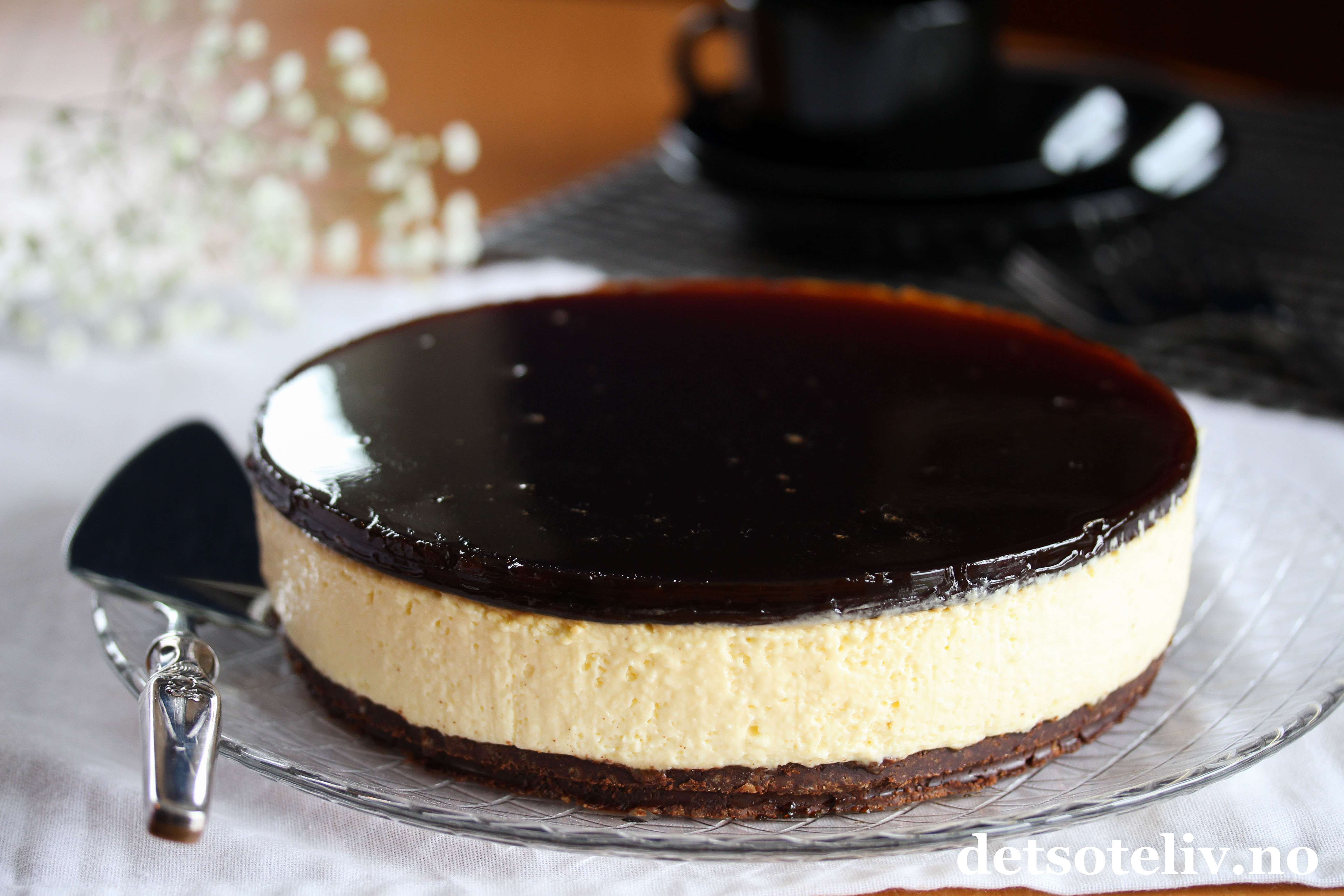 Kaken består av en deilig sjokoladekjeksbunn, luftig fromasj laget med kremost, crème fraîche og hvit sjokolade og - mest originalt av alt - et lag med svart espressogelé smaksatt med kaffelikør på toppen.