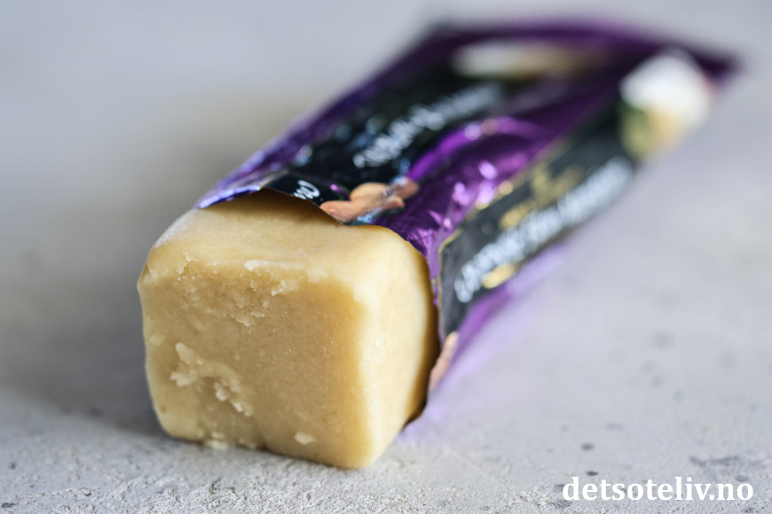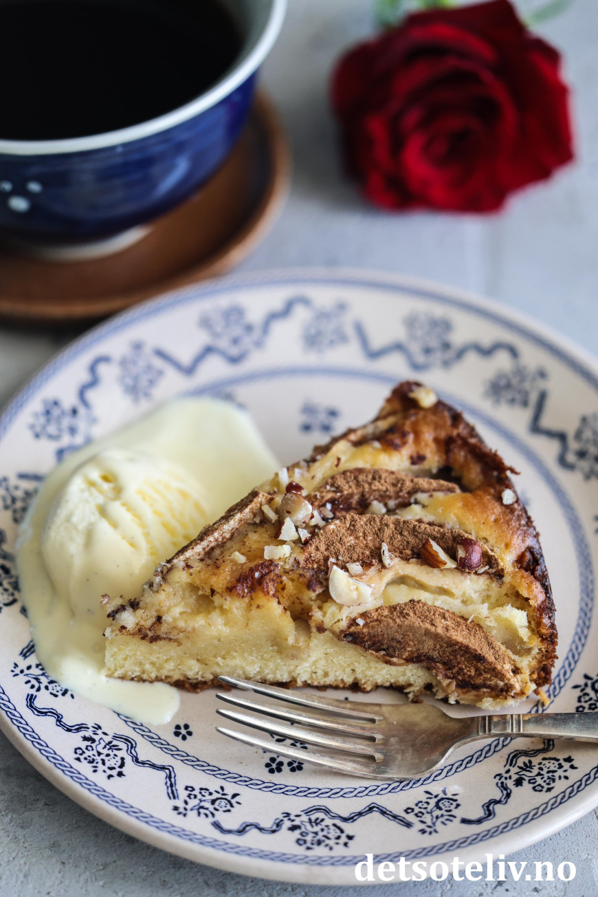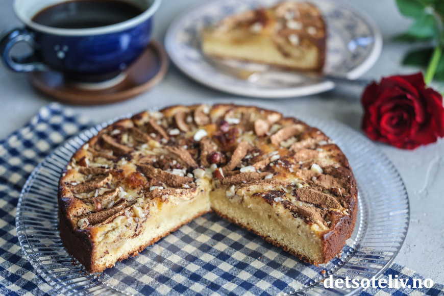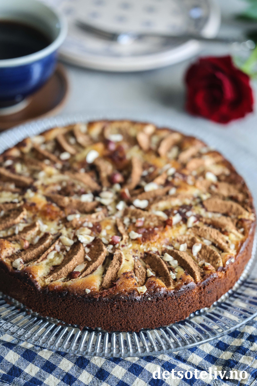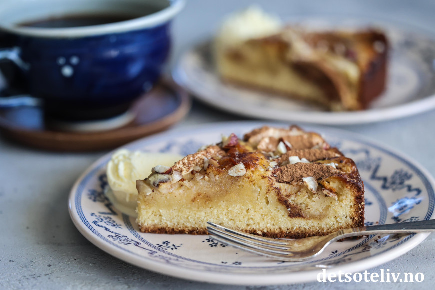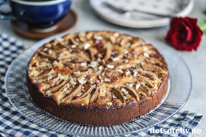 Kaken inneholder hvit sjokolade og blir deilig seig i konsistensen. Kaken toppes med revet marsipan, som gir ekstra god smak, i tillegg til eplebåter, kanel og hakkede hasselnøtter.