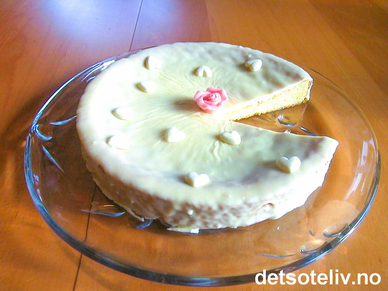 Sett kaken i kjøleskapet til glasuren har stivnet. Pynt kaken med en rosa marsipanrose og hvite marsipanhjerter.