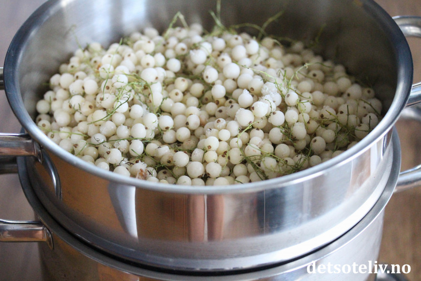 Jeg brukte denne gangen kun hvite rips (og bærene mine var frosne). Det er ikke nødvendig å rense bærene før de has i saftkokeren.