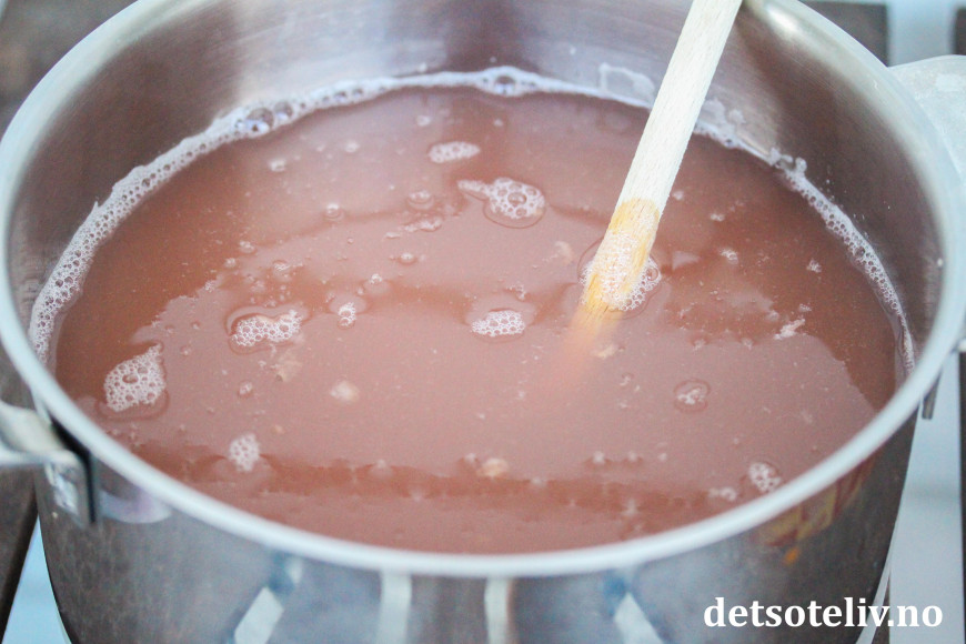Sett kjelen med råsaften på kokeplaten. Det er viktig at kjelen er stor, for her skal det være plass til både råsaften og sukkeret i tillegg til at du skal kunne røre rundt i saften under kokingen uten at det skvulper over.