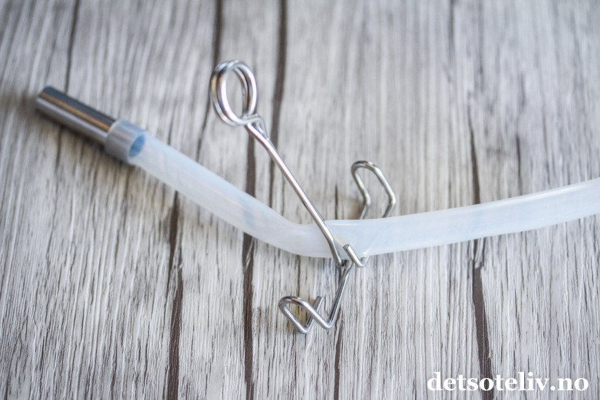 Du vil se at det er en stor åpning nederst som gjør at dampen slipper oppover i kjelen. Åpningen er høyt plassert slik at råsaften ikke skal renne ned i kjelen med vann under. Til den midterste delen av kjelen er det koblet en gummislange hvor saften tappes ut fra. Det følger med med en kraftig slangeklype slik at man har full kontroll på når det renner ut saft.