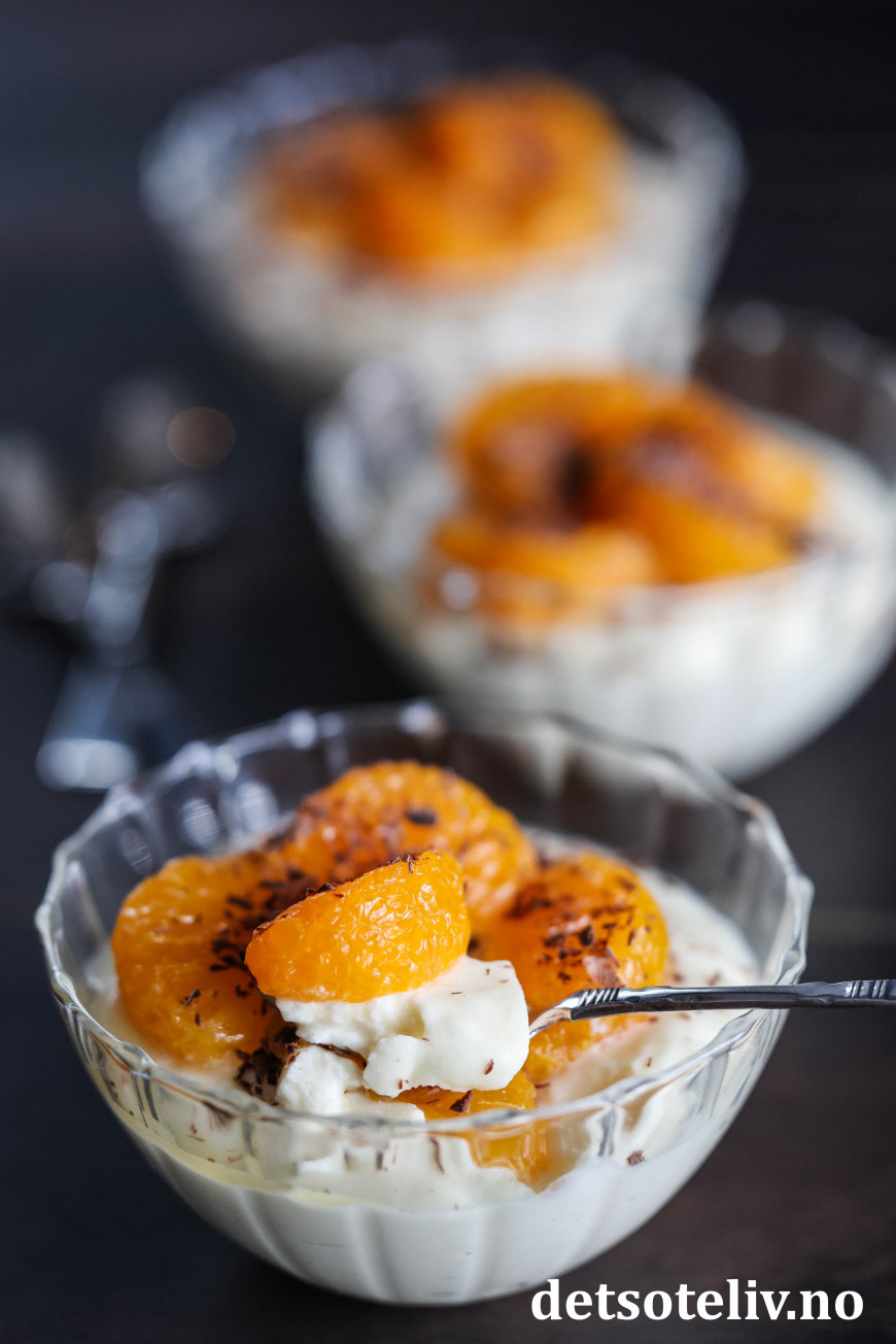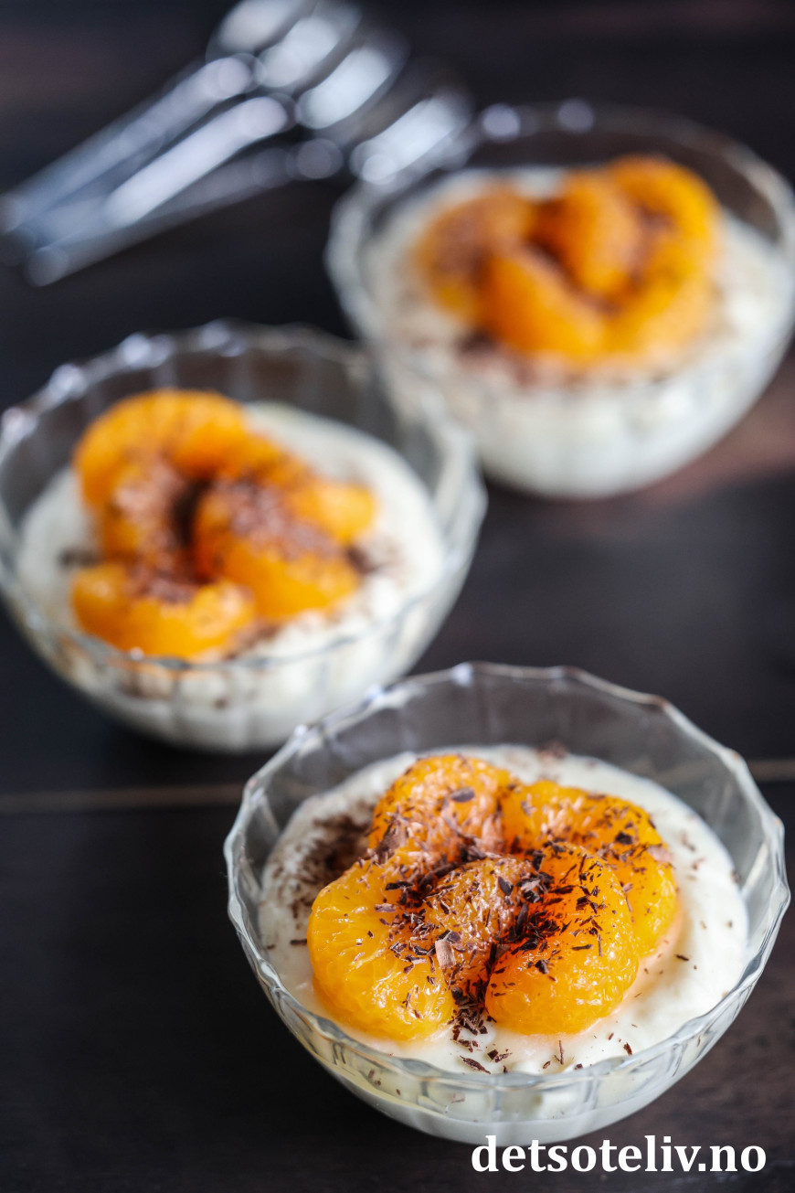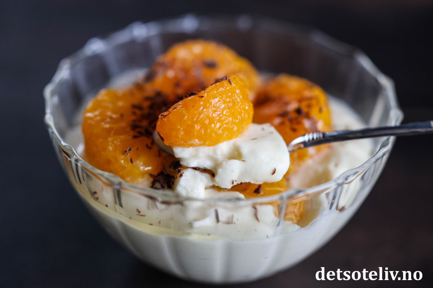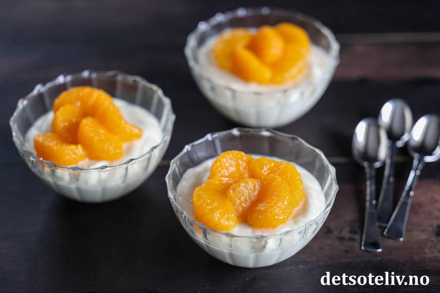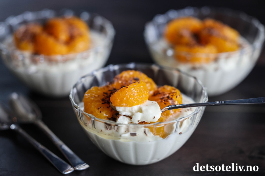 ♥ Jeg har her brukt 1 liten boks hermetiske mandariner (vekt ca. 175 gram uten lake). La mandarinbåtene renne godt av seg i en sil før du legger dem på desserten.