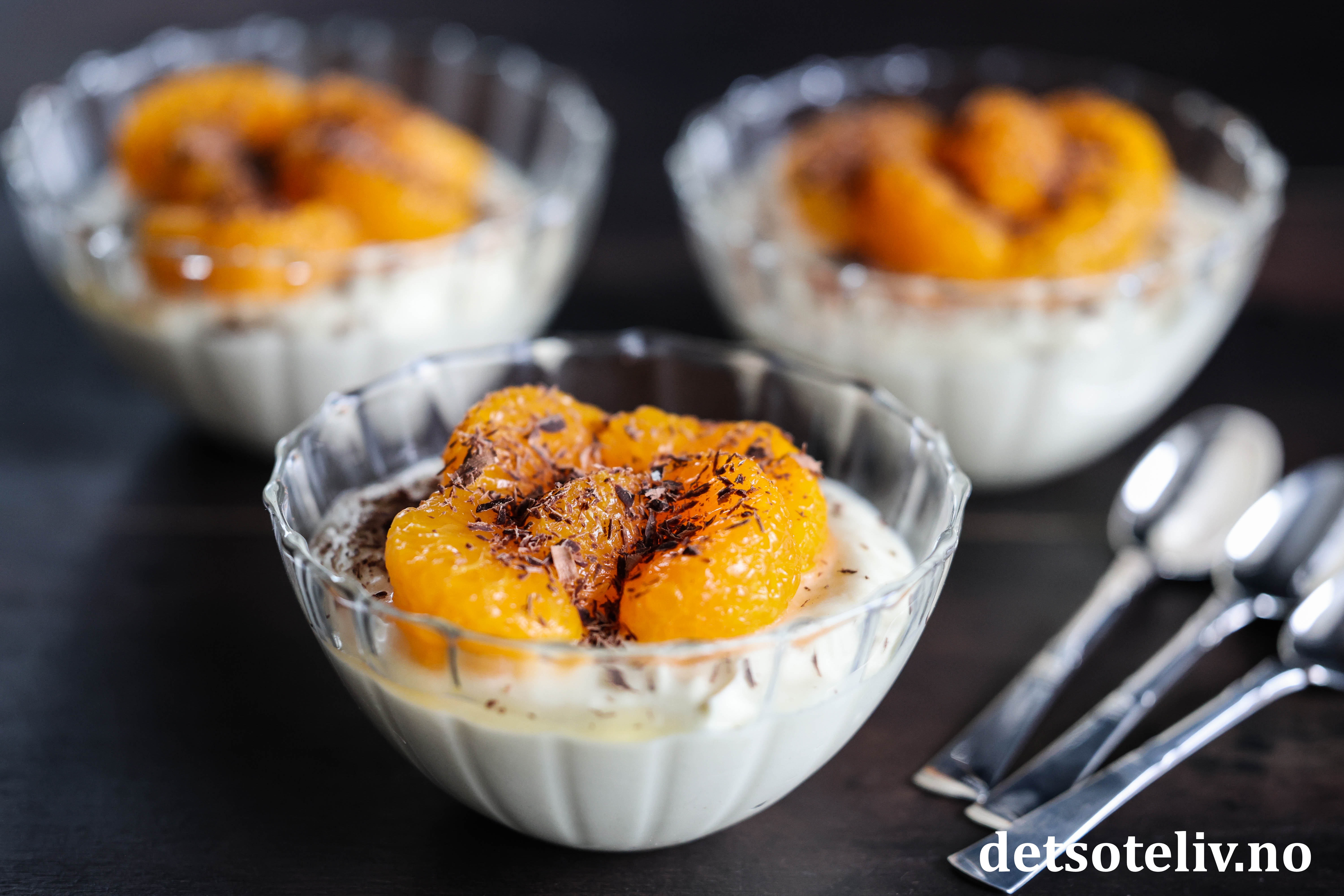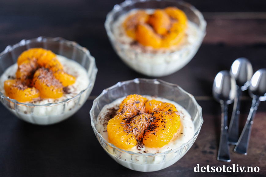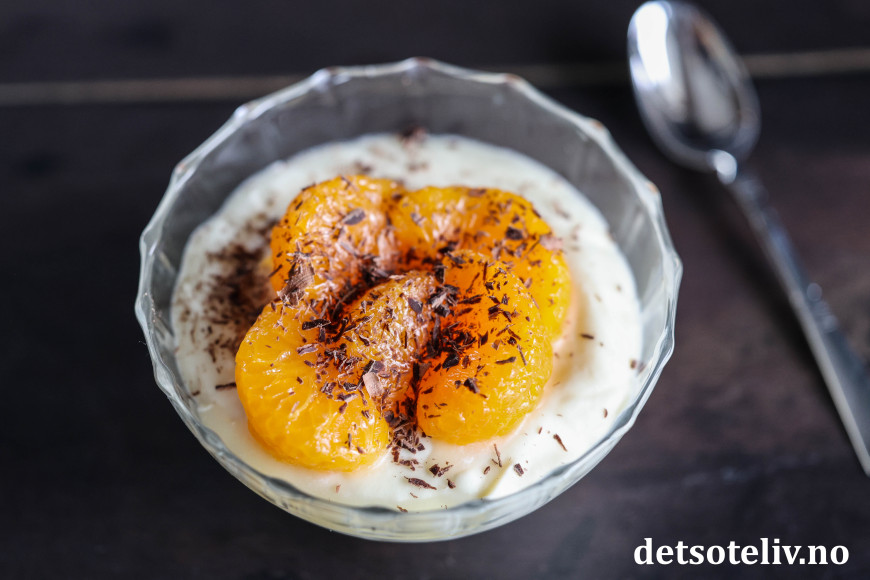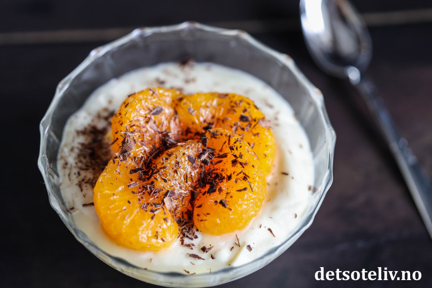 ♥ Jeg har her brukt 1 liten boks hermetiske mandariner (vekt ca. 175 gram uten lake). La mandarinbåtene renne godt av seg i en sil før du legger dem på desserten.