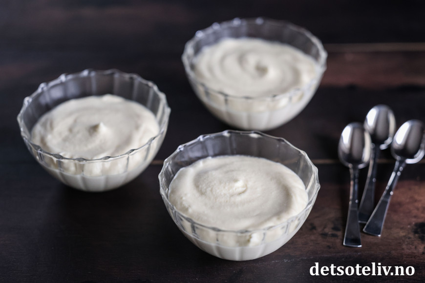 ♥ Desserten bør helst stå i kjøleskapet til dagen etter. Den vil da bli tykkere og få mousseaktig konsistens.