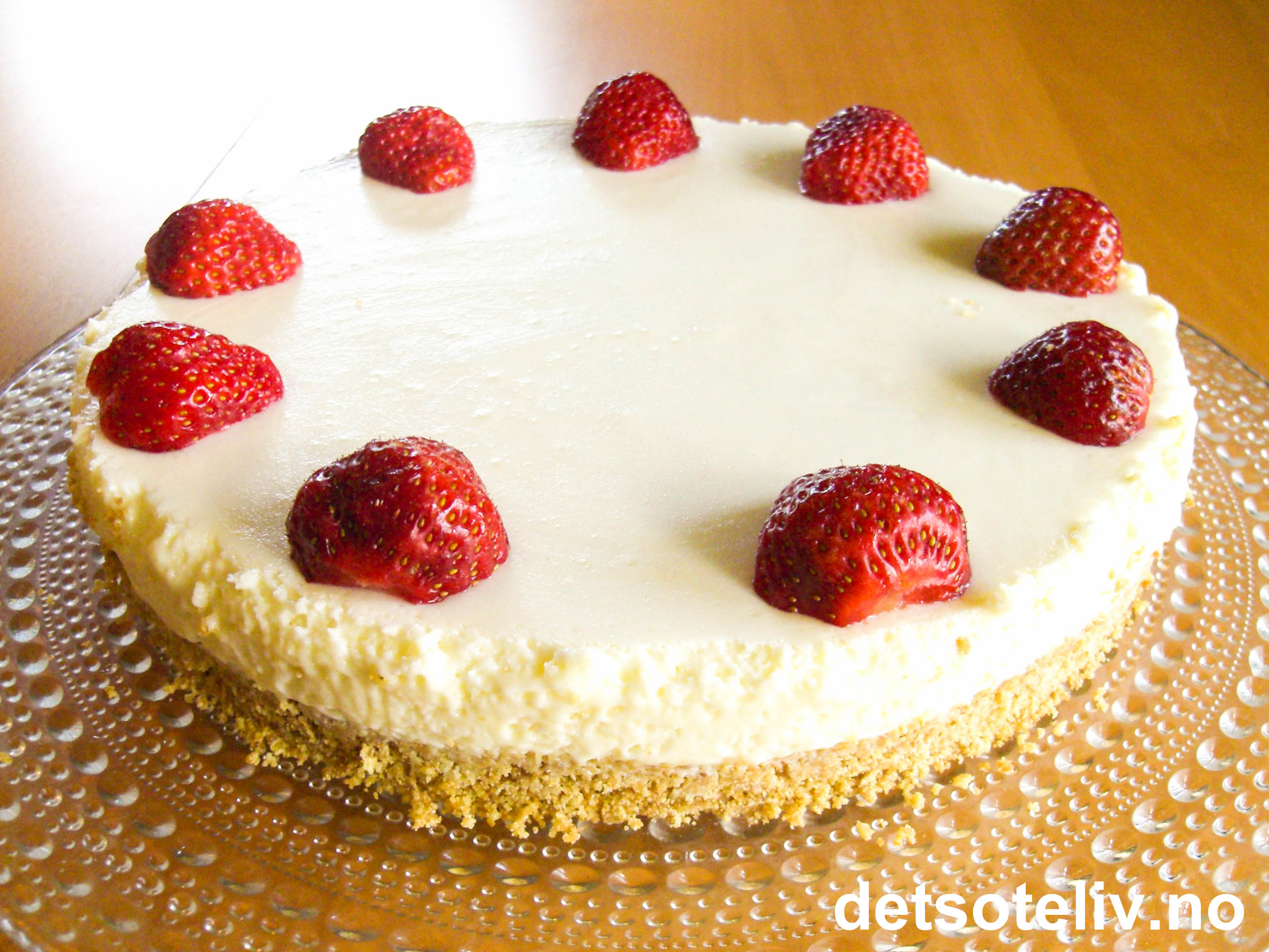 Ha blandingen i formen og sett fatet i kjøleskapet i 24 timer (eller i hvert fall over natten). Løsne forsiktig kakeringen fra kaken med en tynn kniv. Fjern kakeringen og pynt kaken med friske jordbær.