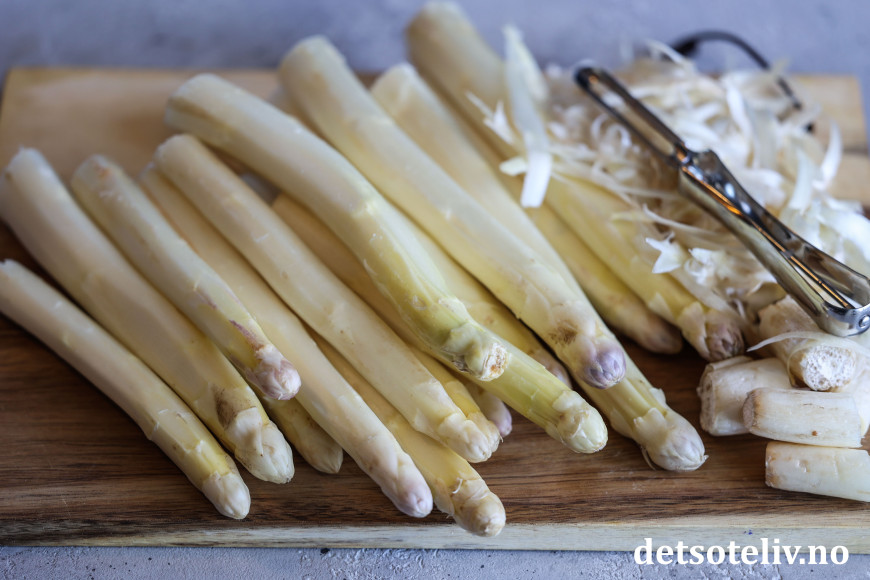 Finn frem hvite asparges. Rens dem ved å først skjære bort ca. 3 cm av den nederste delen av stilken. Bruk så en potetskreller til å forsiktig fjerne det ytterste laget av aspargesene fra "blomsten" på toppen og nedover.