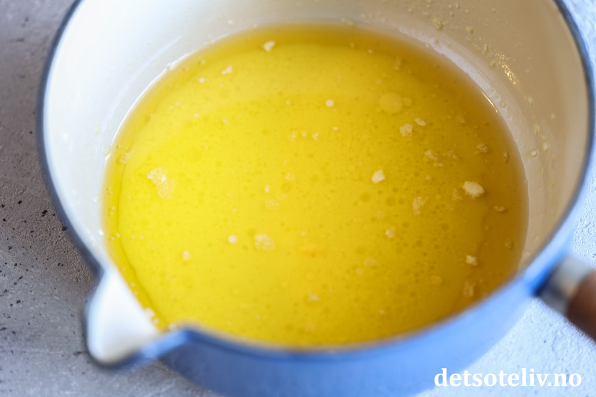 Ha smøret i en kjele. La det smelte på middels varme uten å røre i det. Ta kjelen av platen og la smøret stå i ro i noen minutter. De hvite melkestoffene i smøret vil da synke til bunnen av kjelen. Det er kun det gule smøret (uten det hvite i bunnen av kjelen) som skal brukes i sausen.