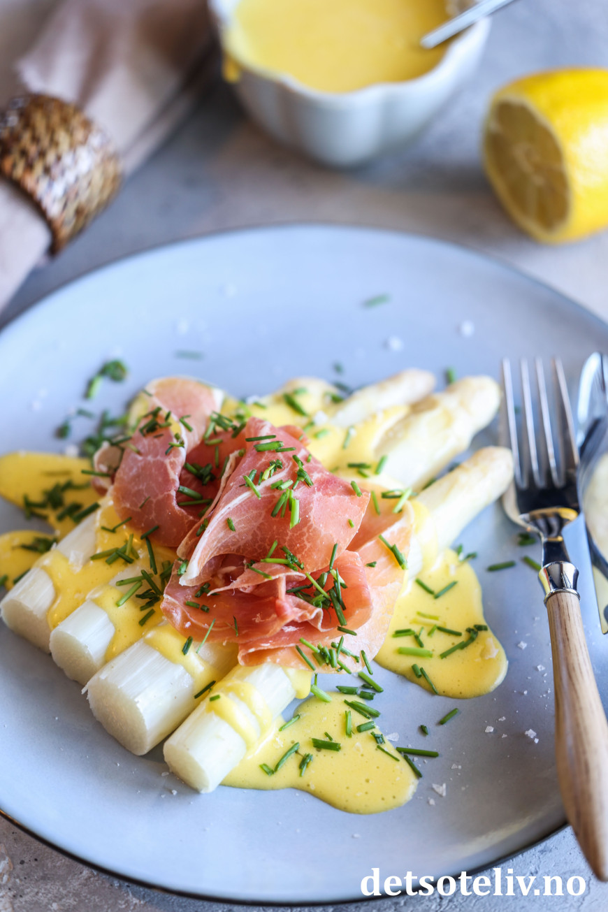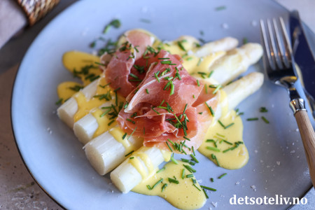Sammen med hjemmelaget Hollandaisesaus og god spekeskinke blir hvite asparges en kjempegod forrett!