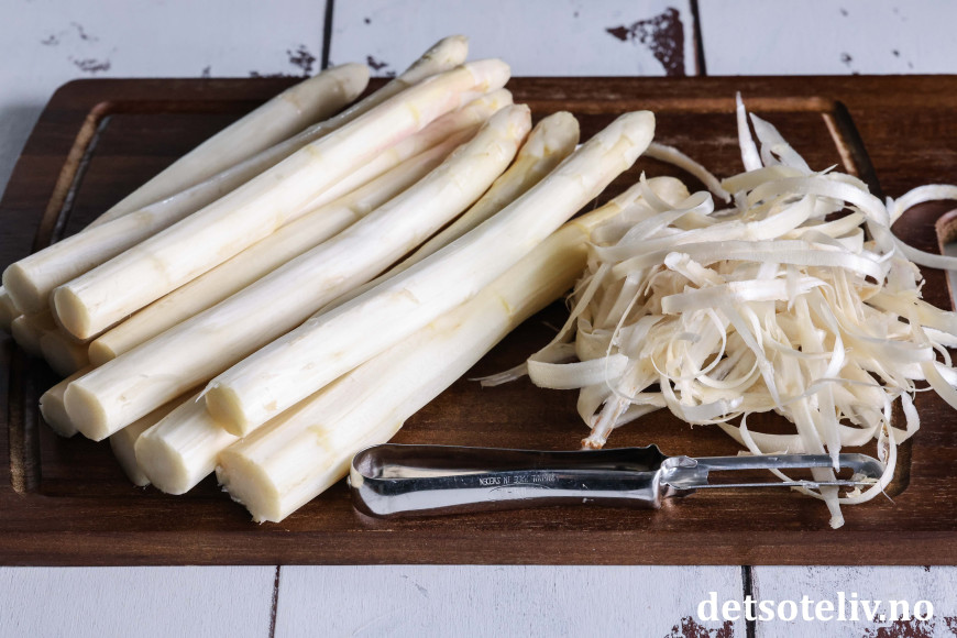 Finn frem hvite asparges. Rens dem ved å først skjære bort ca. 3 cm av den nederste delen av stilken. Bruk så en potetskreller til å forsiktig fjerne det ytterste laget av aspargesene fra "blomsten" på toppen og nedover.