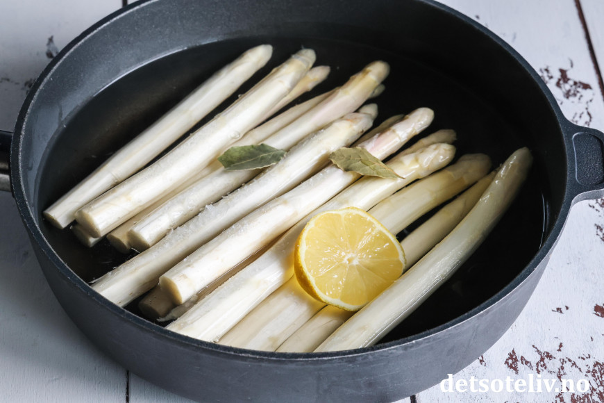 Finn frem en vid kjele eller panne (som aspargesene får plass i) og ha i vann, salt, sukker, sitronsaft, laurbærblad og sitronskive. Gi vannet et oppkok og legg forsiktig de rensede aspargesene ned i vannet. La aspargesene småkoke i ca. 8 - 10 minutter (avhengig av tykkelse på aspargesene).