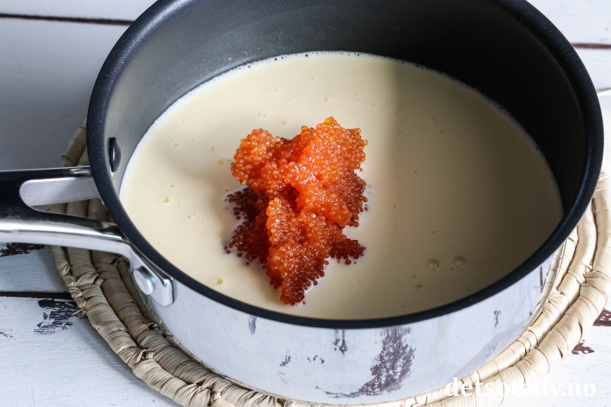 ♥ Det er viktig at du tar kjelen av platen når du tilsetter rognkjeksrogn, og at du ikke koker rømmen opp igjen etter at rognen er tilsatt. Rognen vil nemlig kunne bli gummiaktig ved for sterk varme, og det vil ødelegge hele matopplevelsen. Jeg varmer rømmen opp og holder rømmesausen varm i kjelen helt frem til servering. Så rører jeg inn rognkjeksrogn rett før servering.