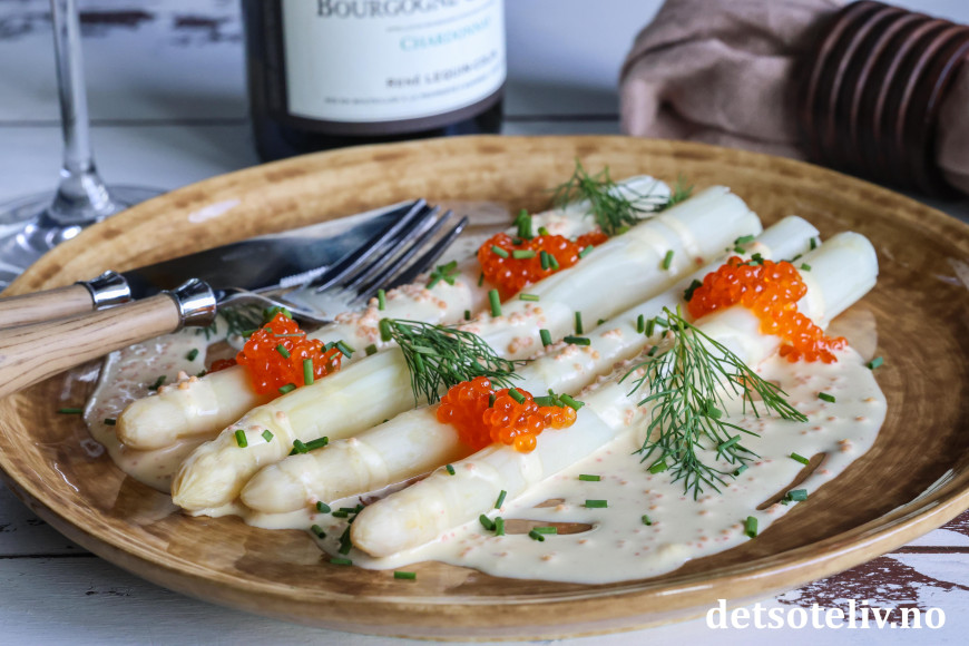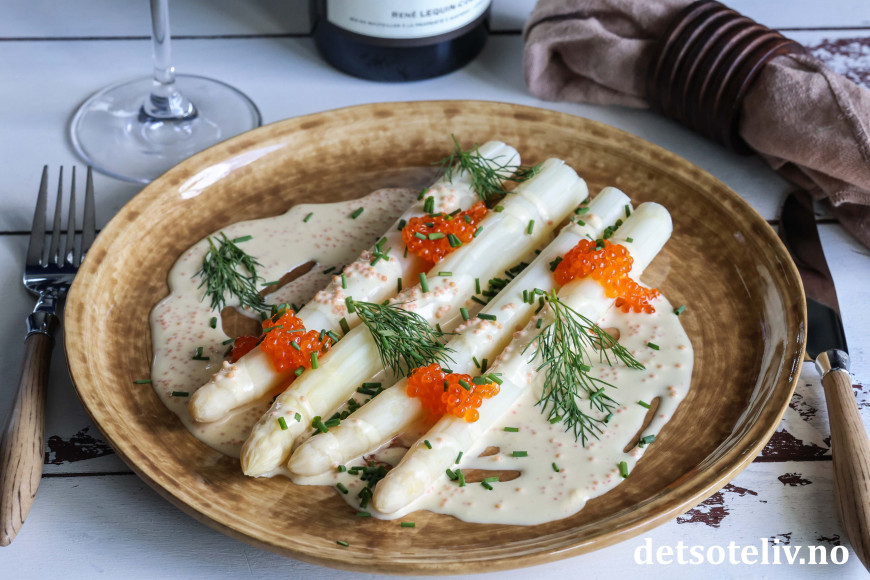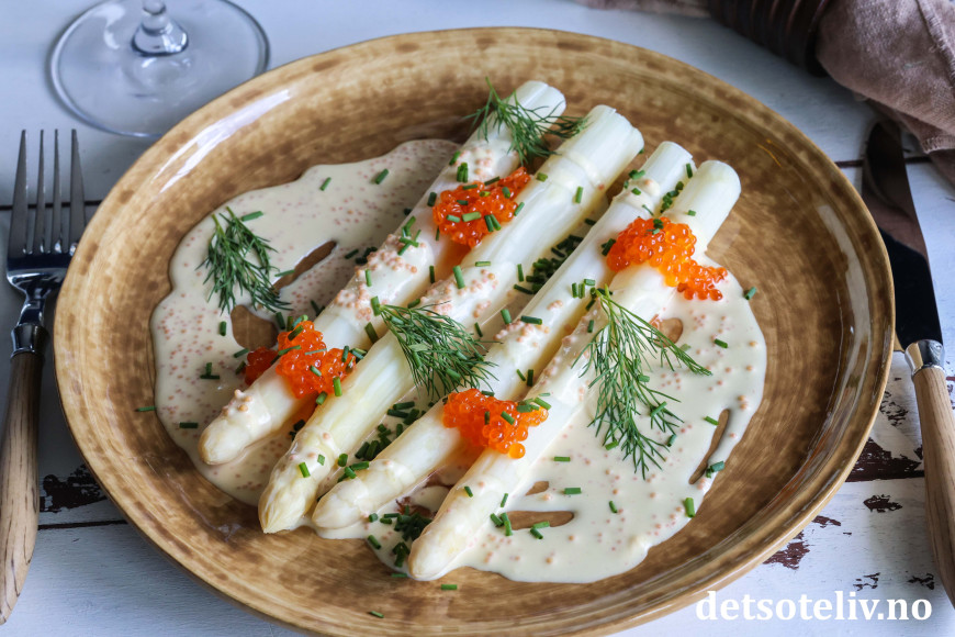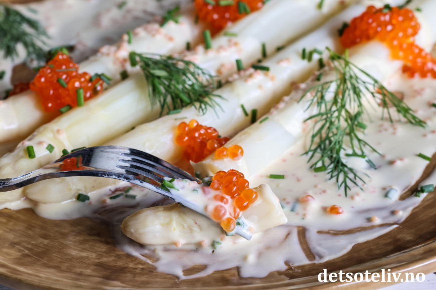 ♥ Ørretrogn eller lakserogn skal ikke varmes og legges på aspargesene rett fra glasset.
