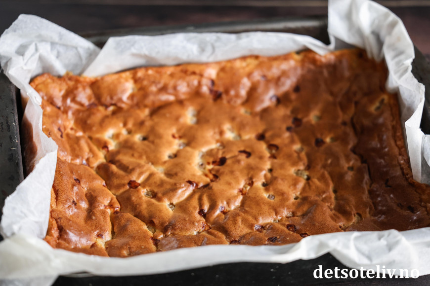 Ha deigen i en liten, bakepapirkledd langpanne (ca 20 x 30 cm).